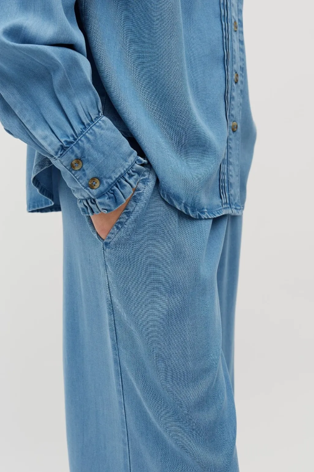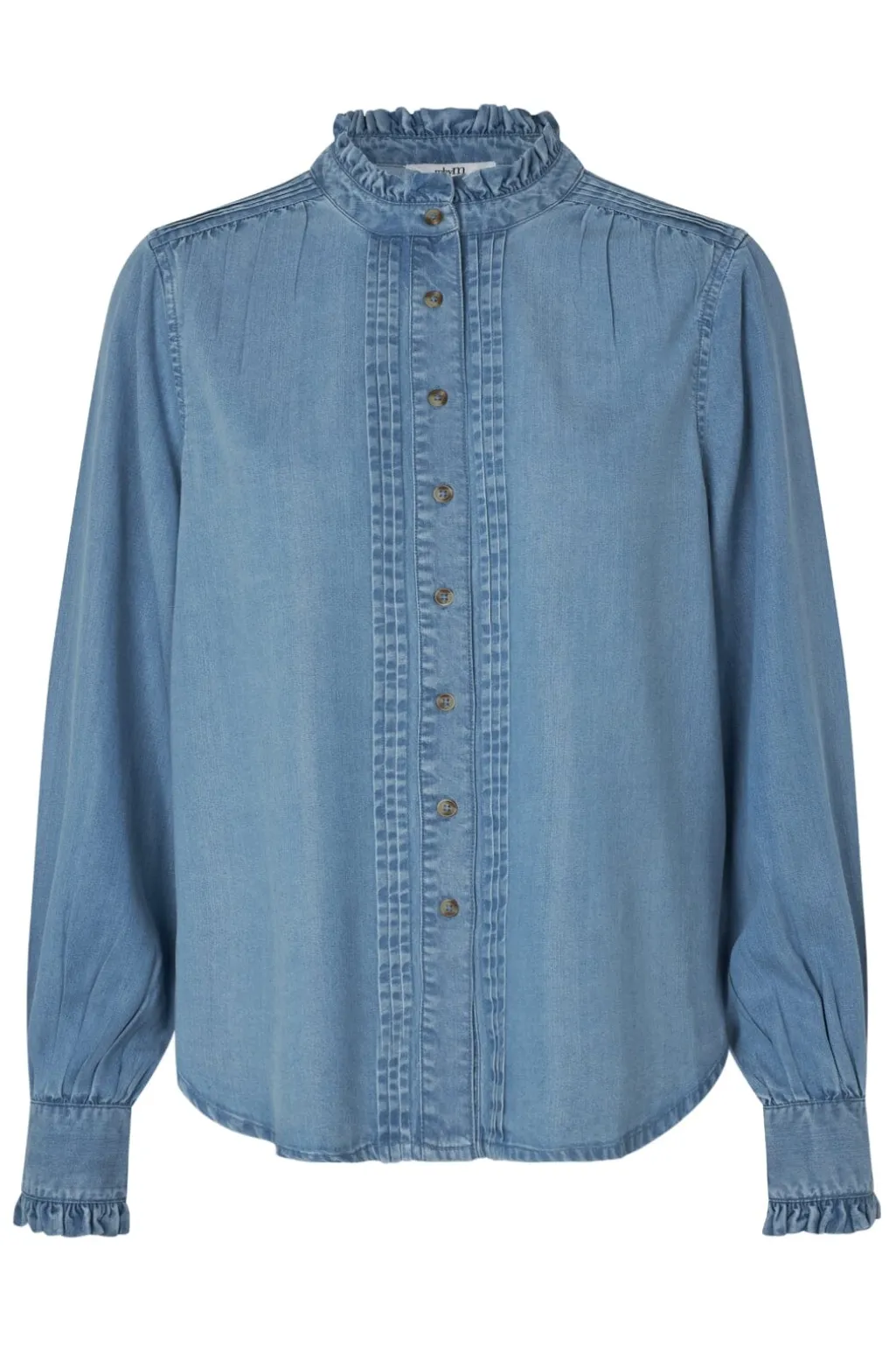 Lyseblå bluse fra MbyM med rynkede detaljer ved kraven og manchetterne. Blusen har en høj hals og lukkes med knapper foran.