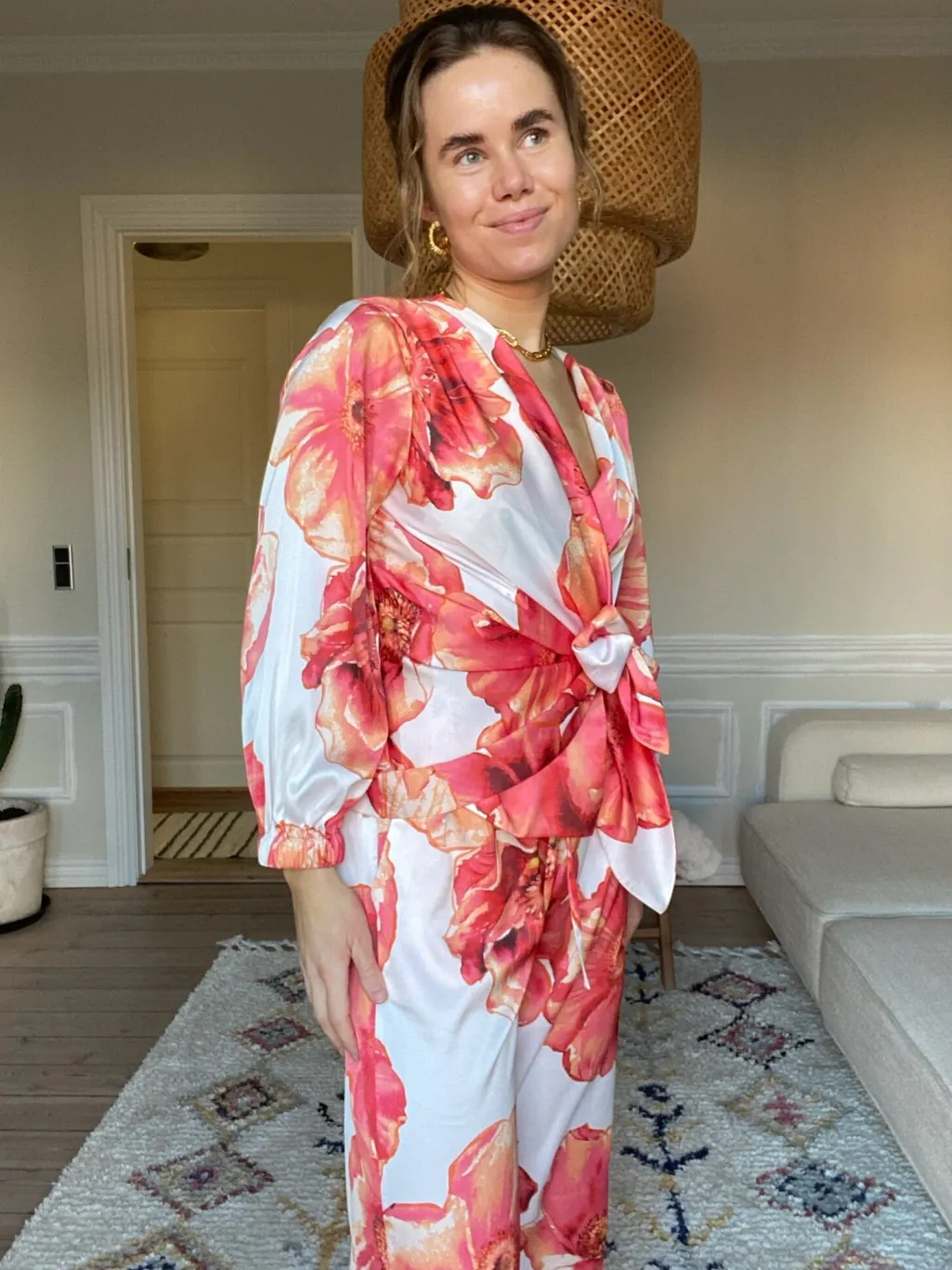 Bukser fra Karmamia med store blomster i orange og hvide nuancer på hvid bund. Bukserne har elastisk talje med snoretræk og en løs pasform.