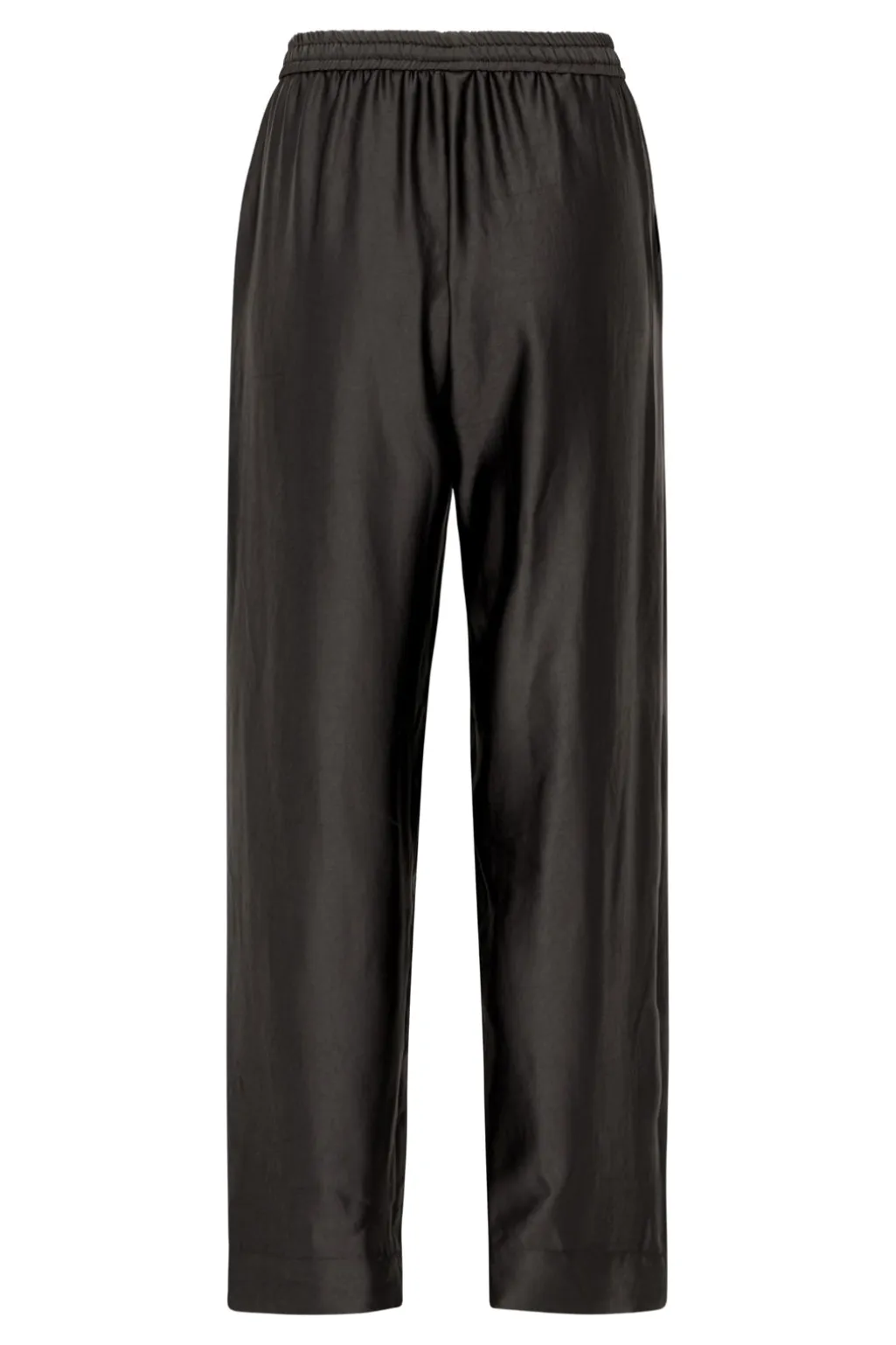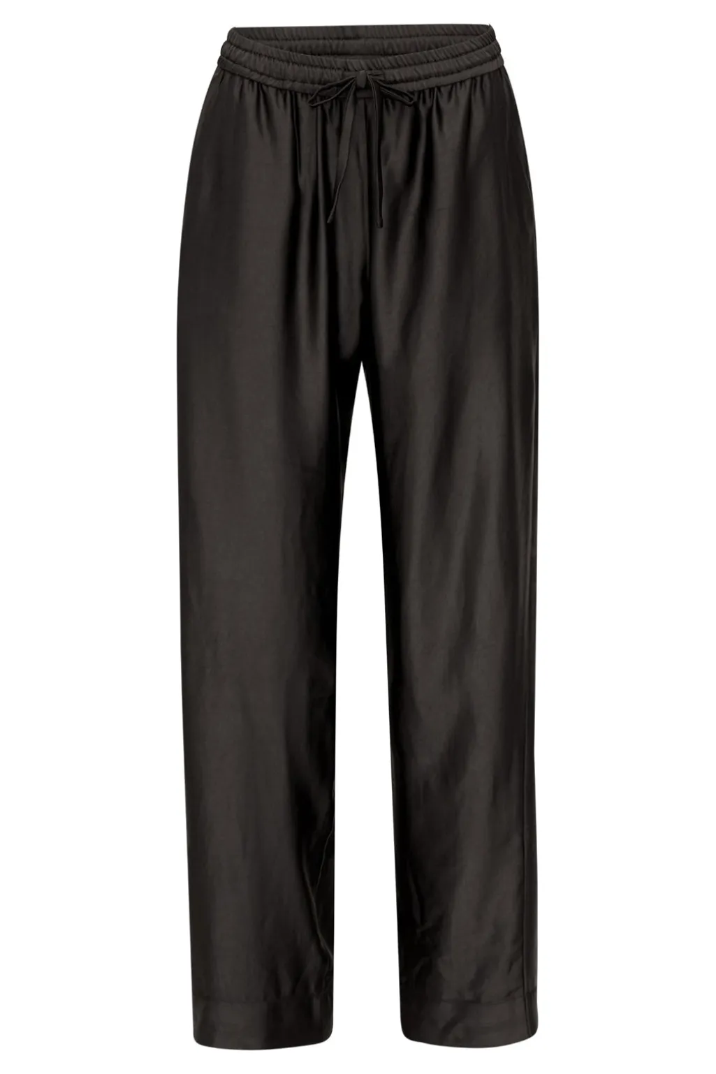 Sorte satinbukser fra Karmamia med løs pasform. Bukserne har en skinnende overflade og en behagelig ankellængde med elastik og snøre i taljen.