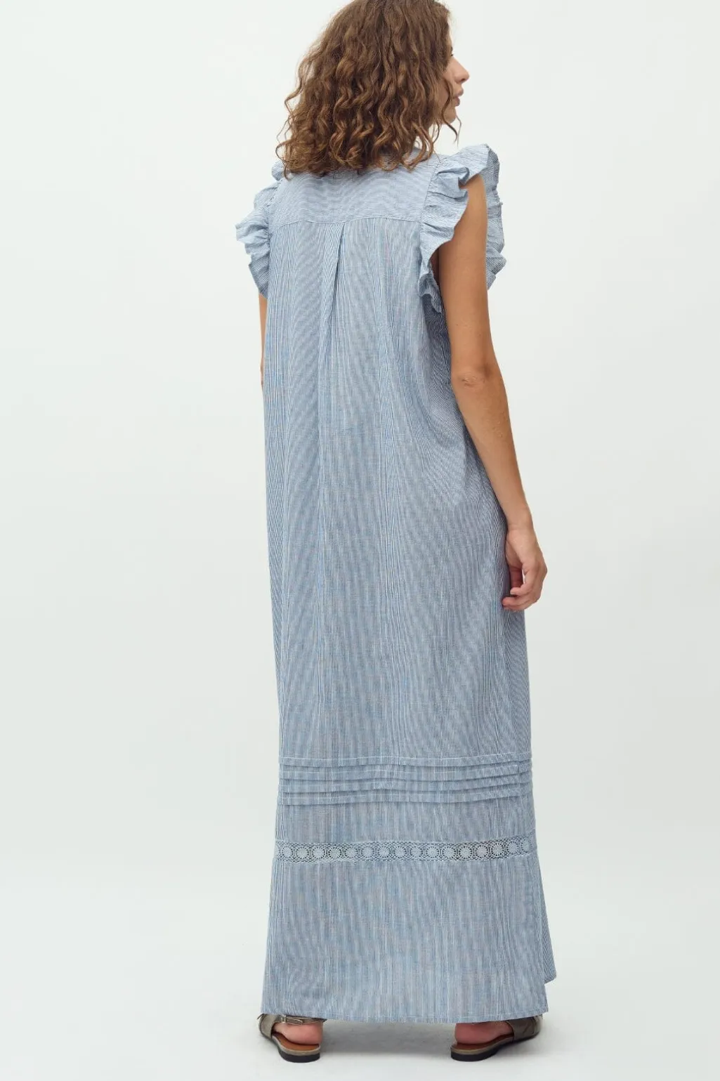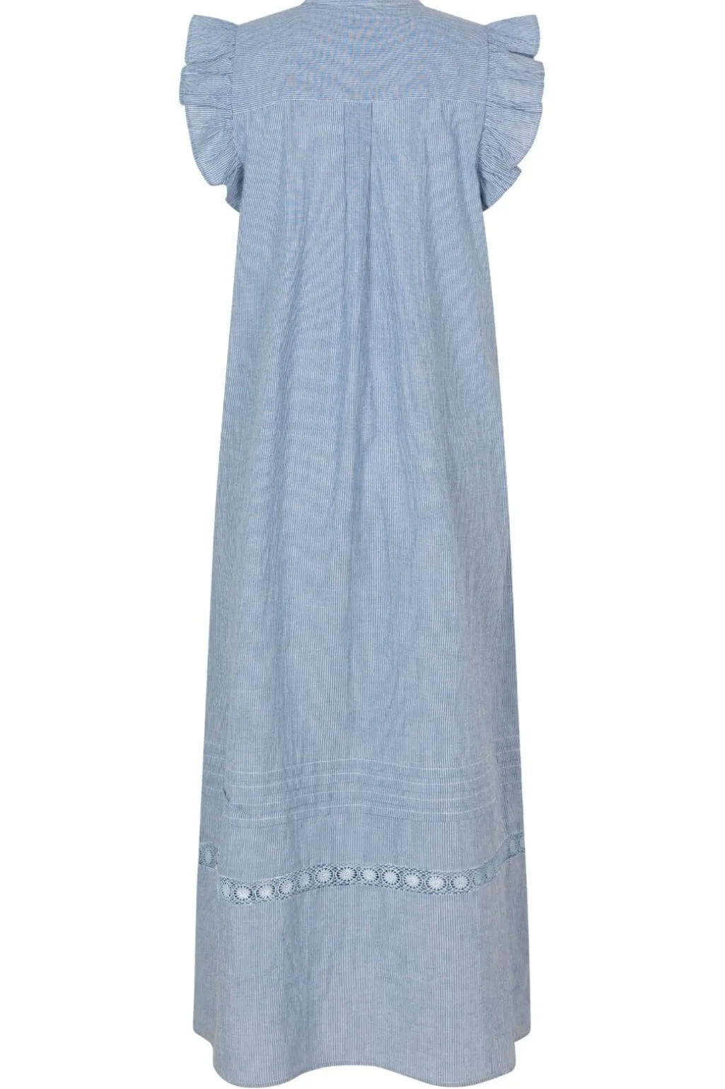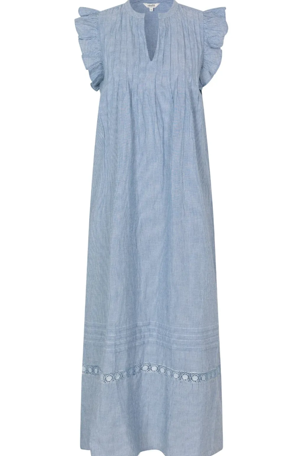 Lang kjole fra MbyM i blå og hvide striber. Kjolen har flæser ved ærmerne og blondedetaljer langs kanten. Den dekorative syning giver kjolen et håndlavet præg.