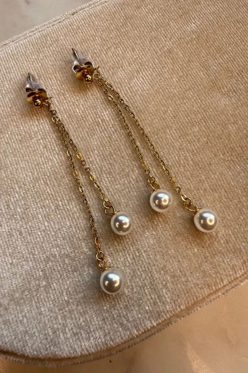 Øreringe fra Mellow Moon i gylden farve. Hver ørering har to tynde kæder med kugleformede perler i enderne.