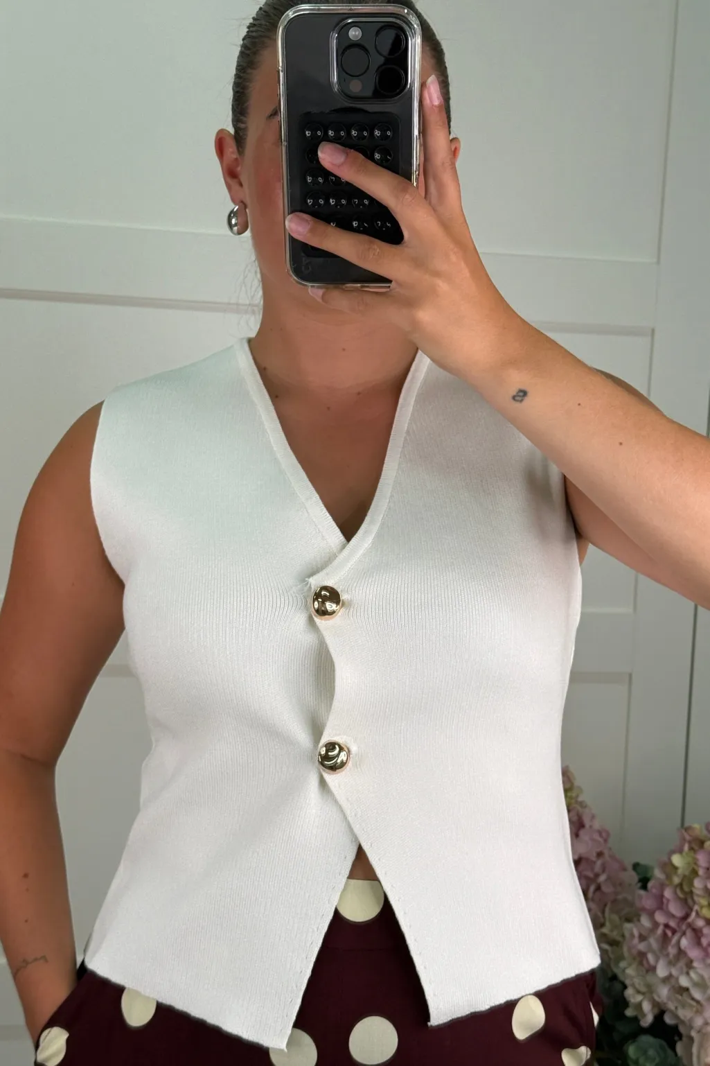 Hvid top fra A-bee, lavet af 100 % bomuld. Toppen har en V-hals, slim fit-pasform og knapper som lukning.