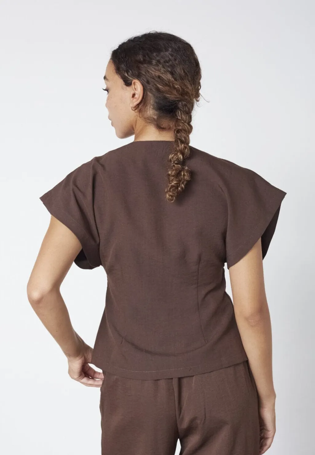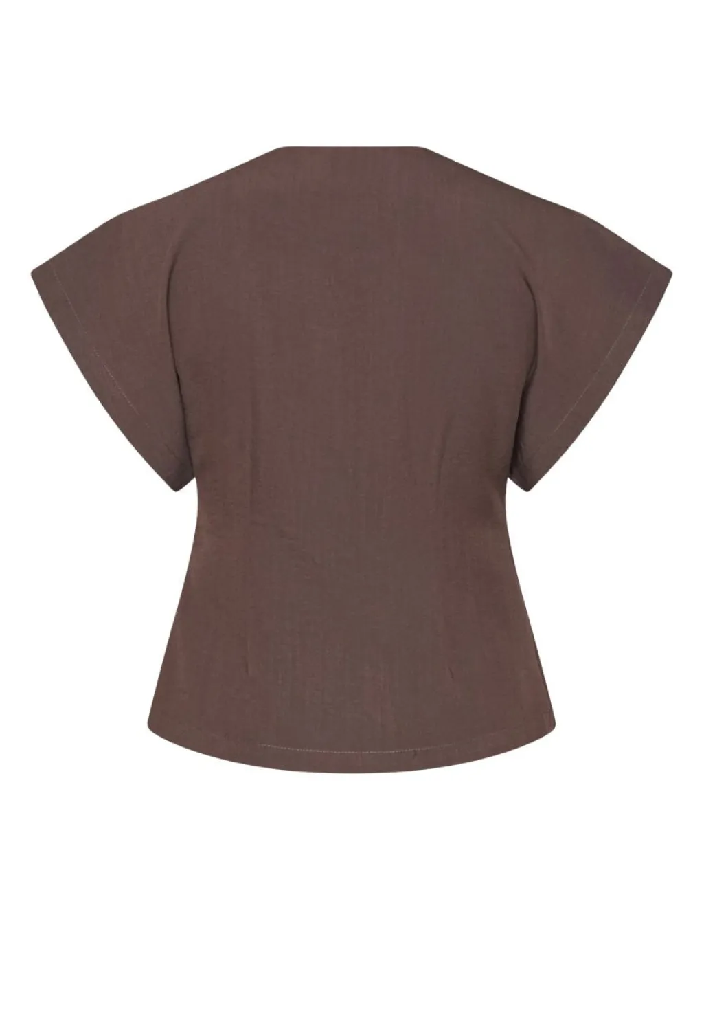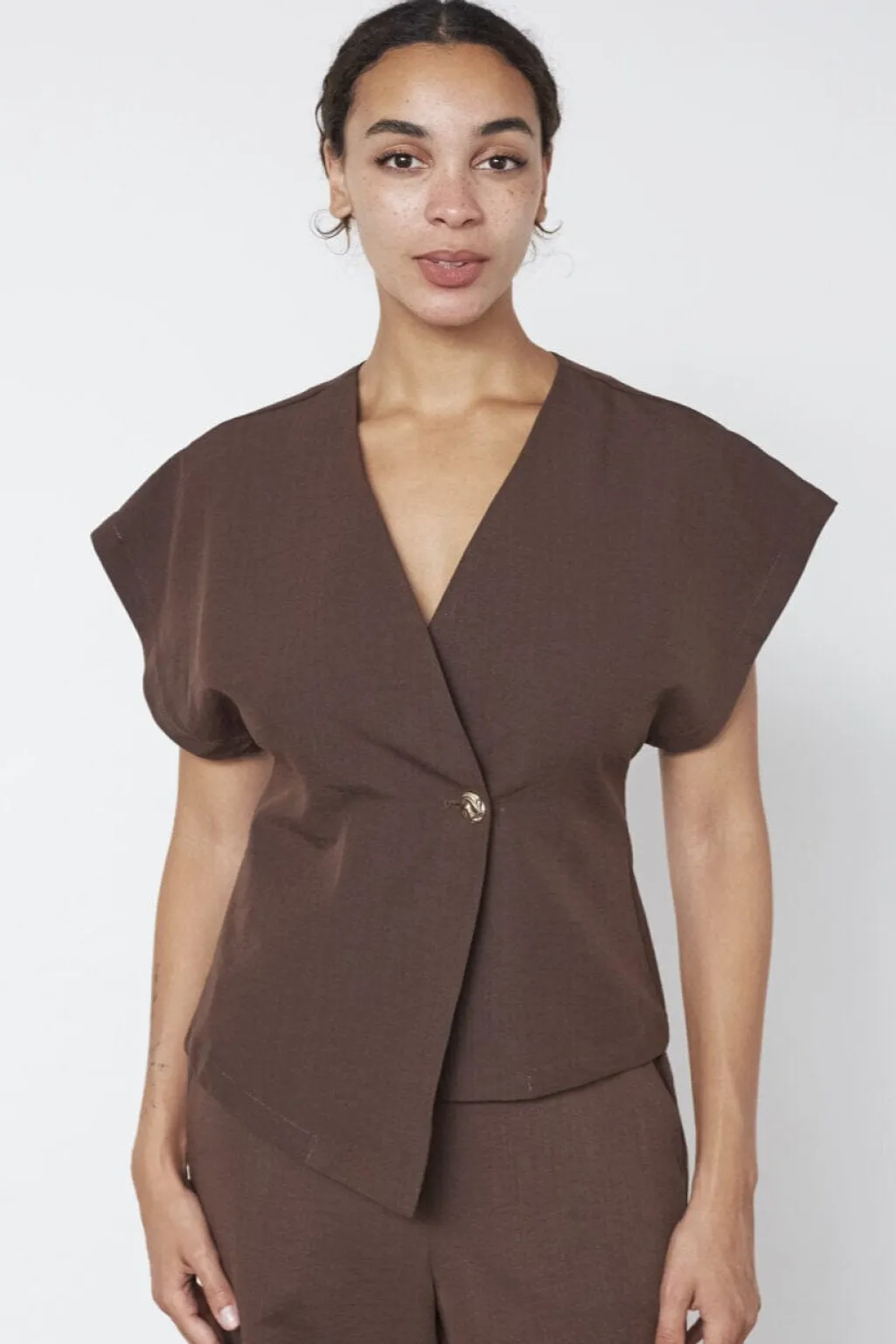 Brun vest fra Sisters Point i en ensfarvet nuance. Vesten har en asymmetrisk lukning med en dekorativ knap og korte, vide ærmer.