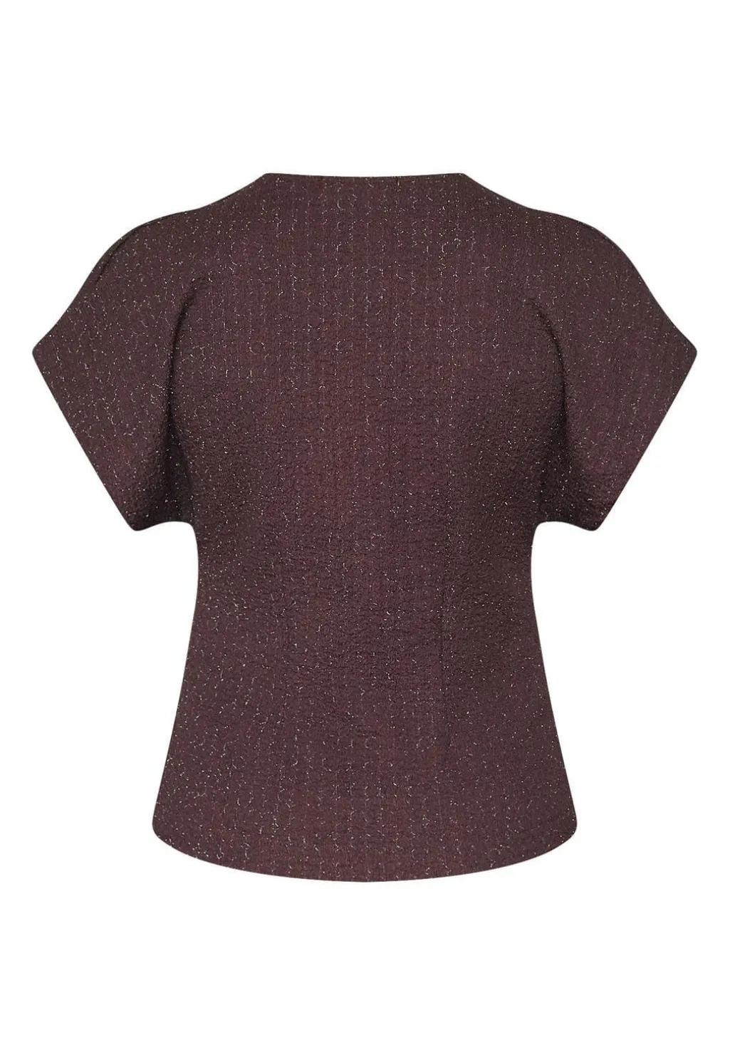 er en elegant vest med et asymmetrisk snit og en v-udskæring. Den har en struktureret overflade. Vesten har brede skuldre og en enkelt knaplukning, der skaber en moderne og unik stil. Modellen har en str. S på.