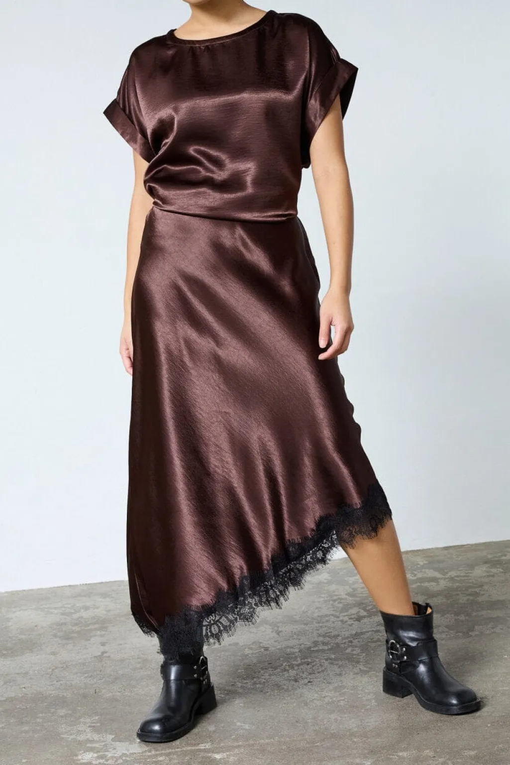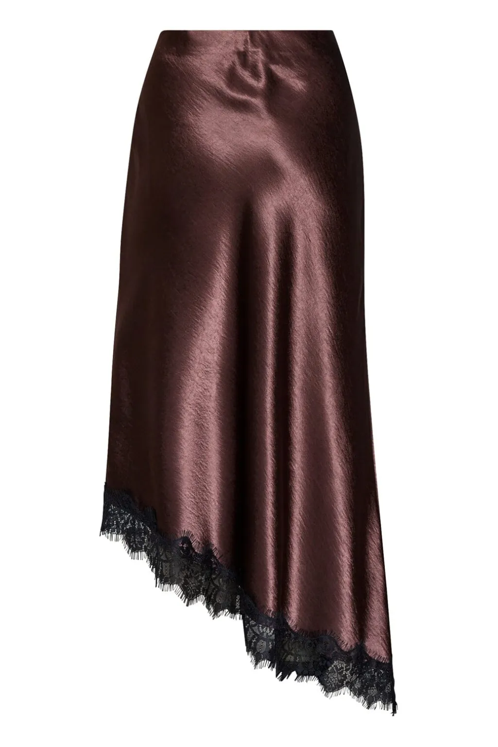 Nederdel fra Sisters Point i brun og sort med et skinnende satinlook. Materialet er vævet polyester med et asymmetrisk snit.