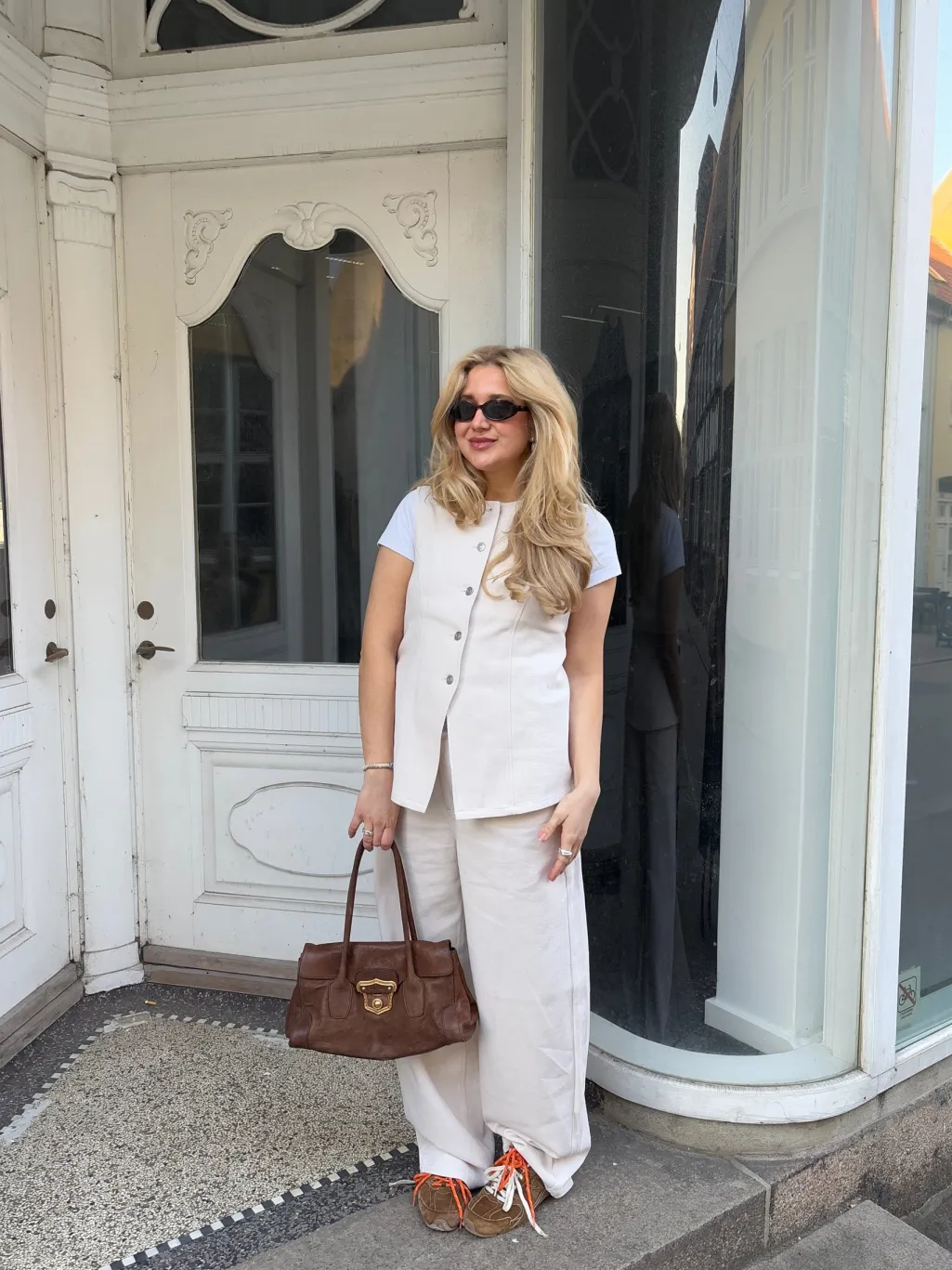 Ærmeløs vest fra Global Funk i en lys ecru-farve. Vesten har en rund hals, knapper foran og dekorative syninger, der giver et rent og enkelt udtryk.