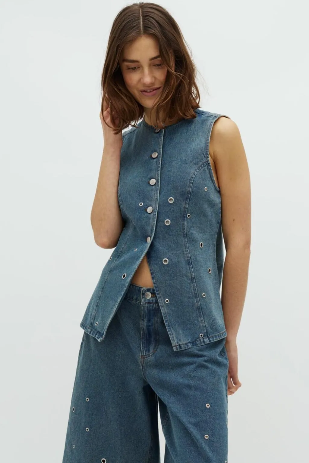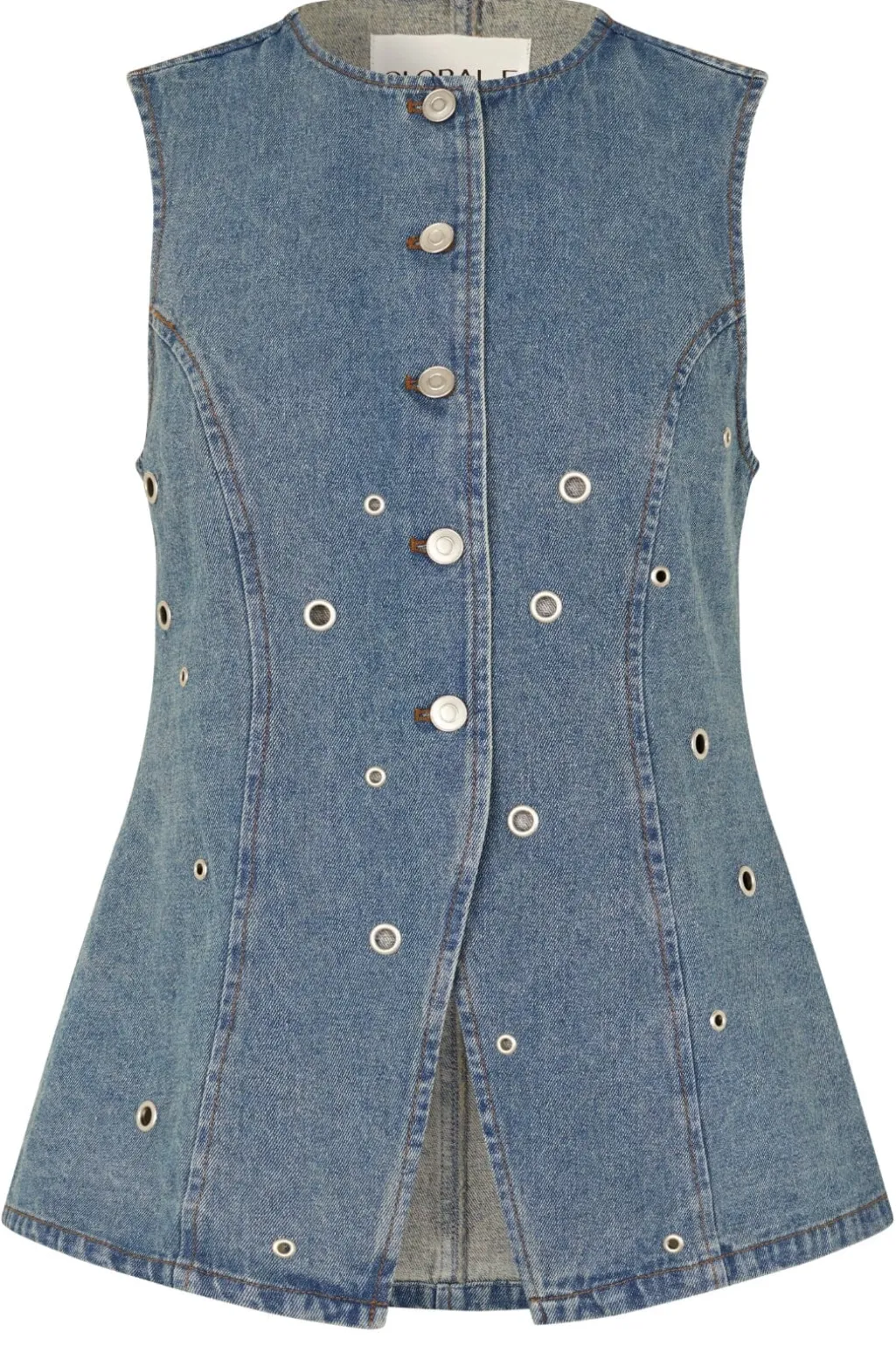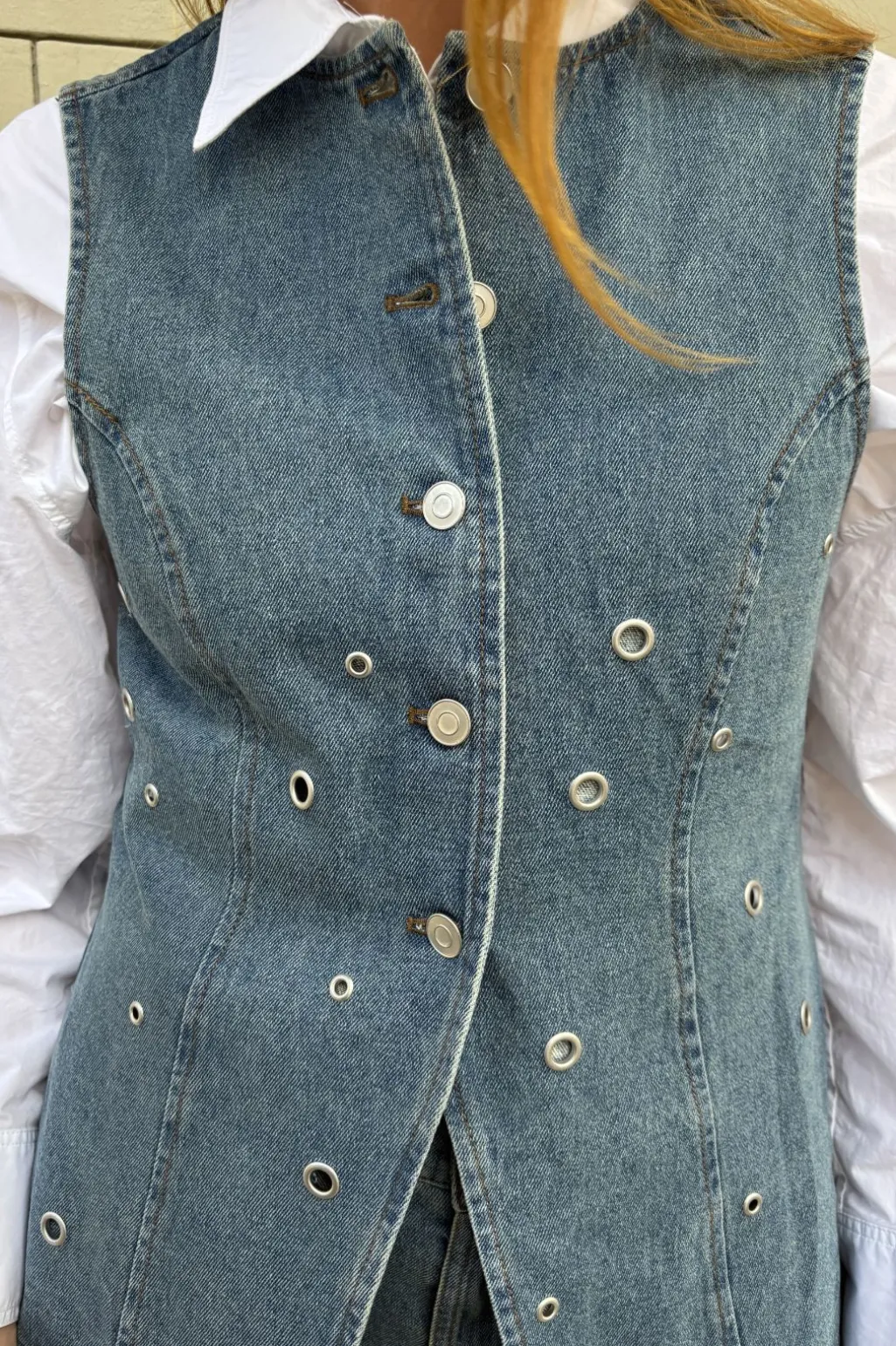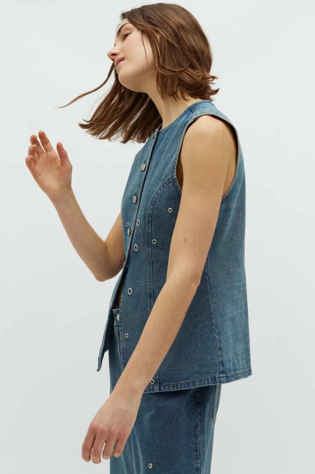 Ærmeløs denimvest fra Global Funk i en lys mud wash-farvetone. Vesten har sølvfarvede trykknapper og runde øjer som dekorative detaljer, der giver et rustikt præg.