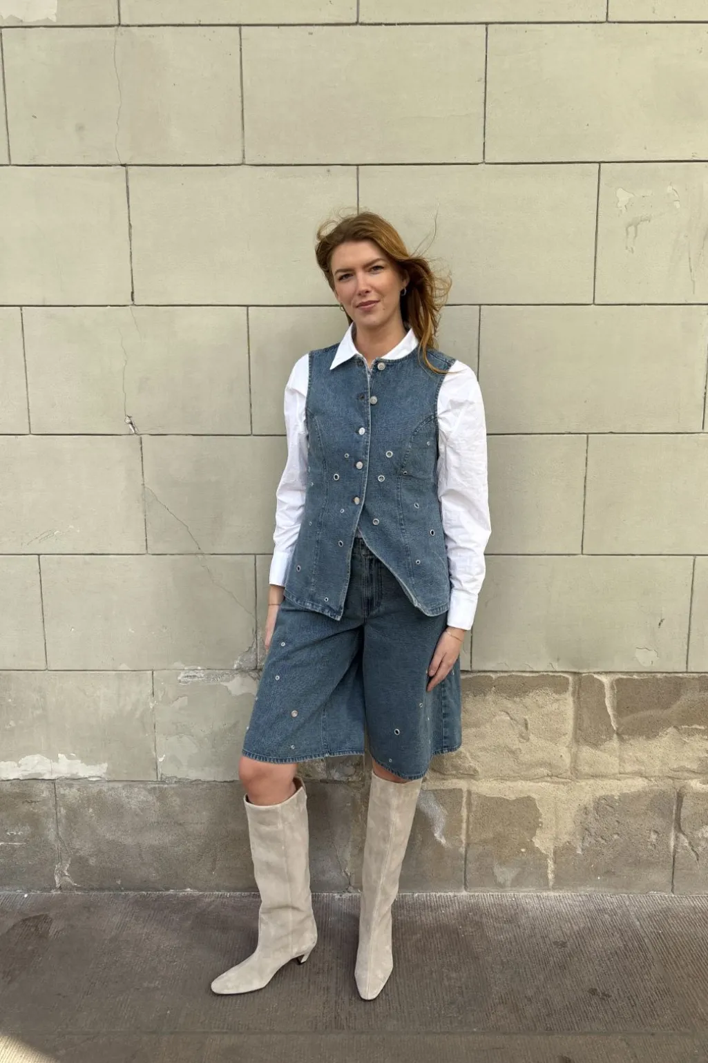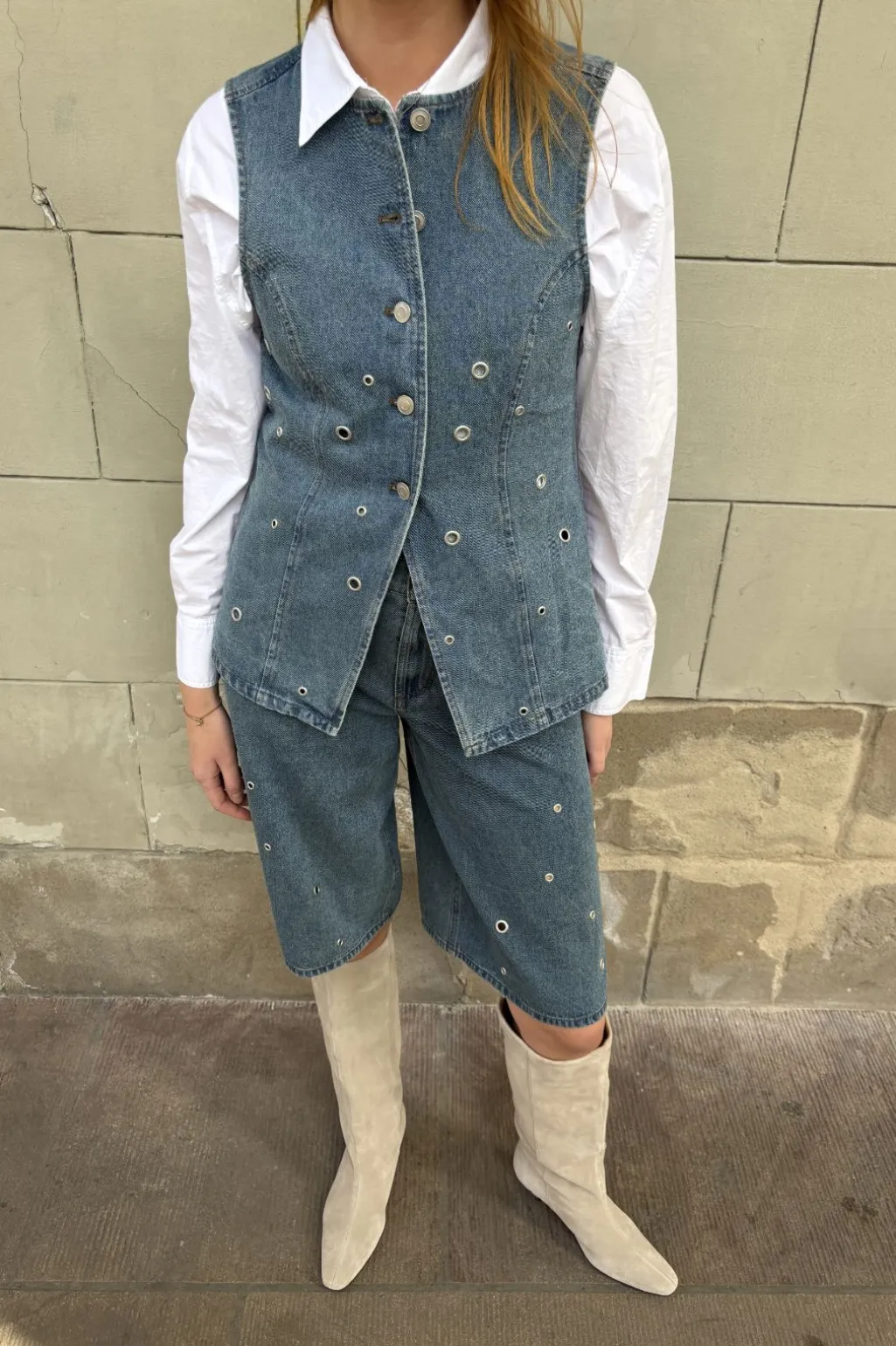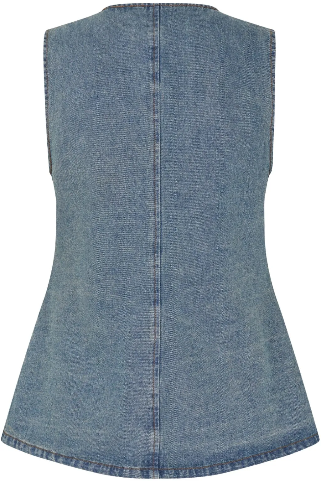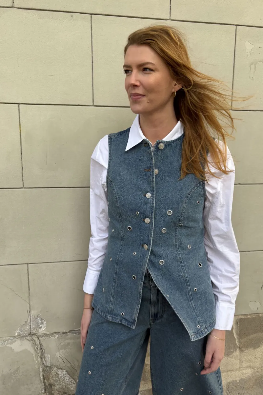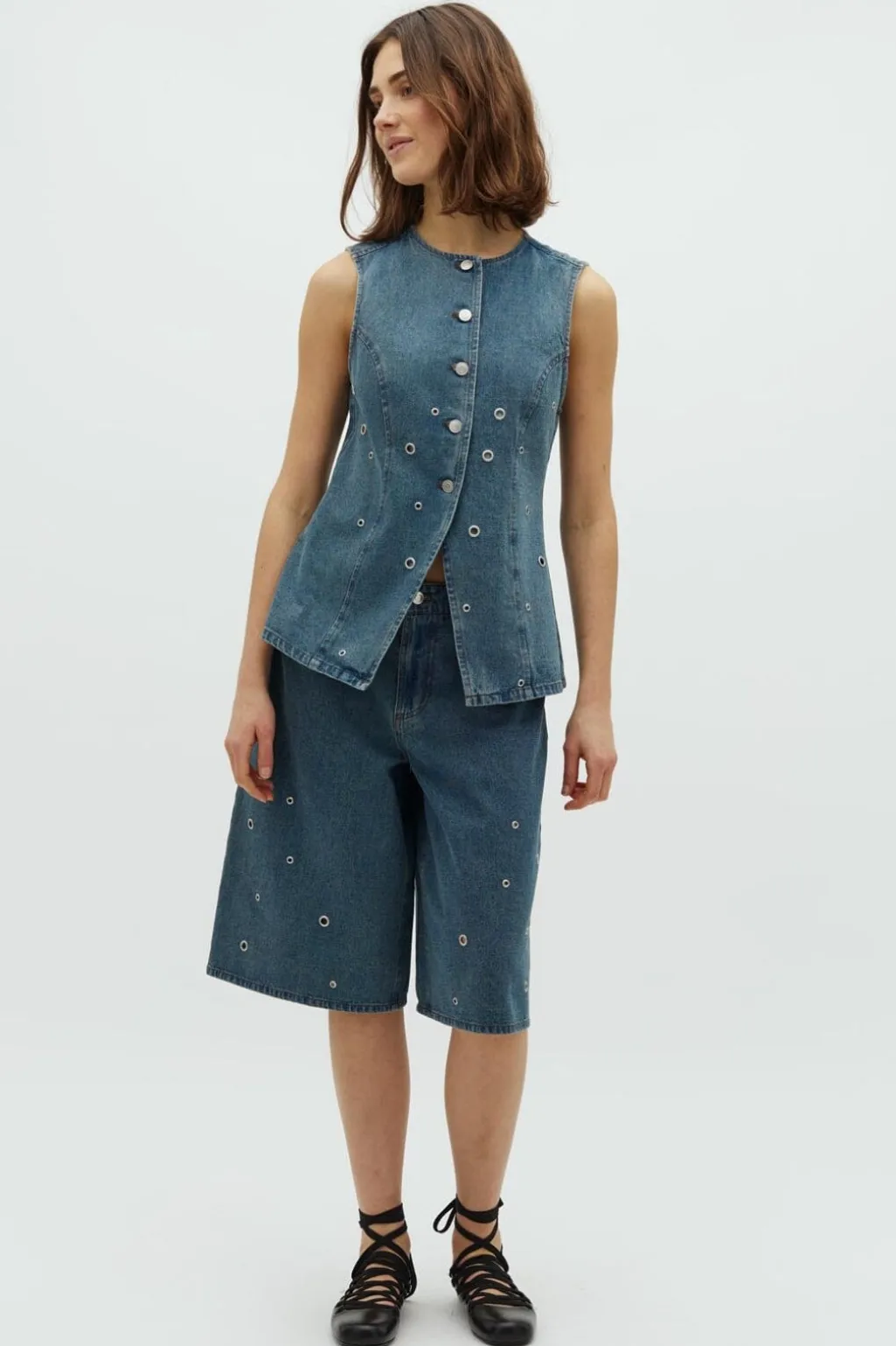 Ærmeløs denimvest fra Global Funk i en lys mud wash-farvetone. Vesten har sølvfarvede trykknapper og runde øjer som dekorative detaljer, der giver et rustikt præg.