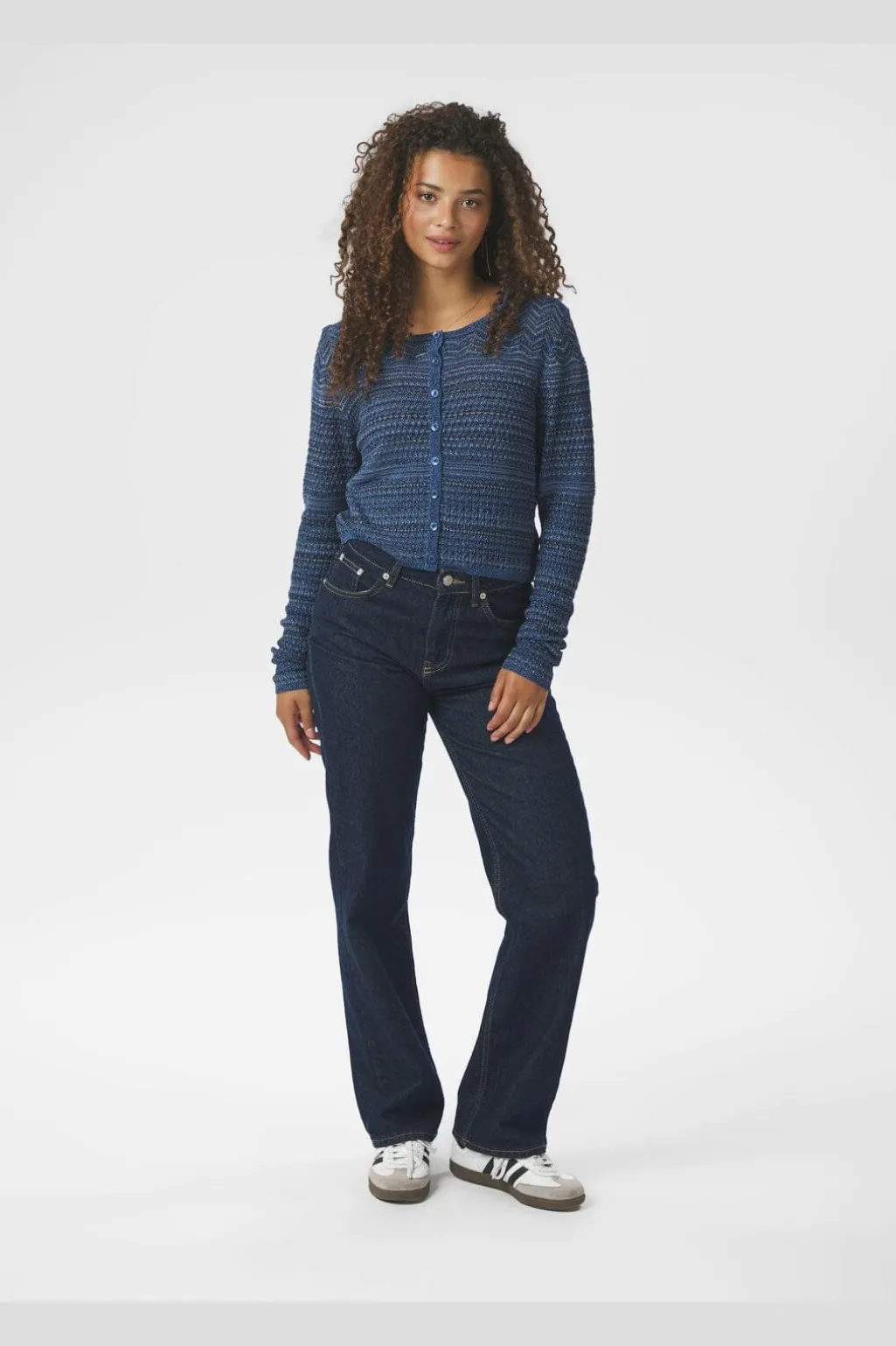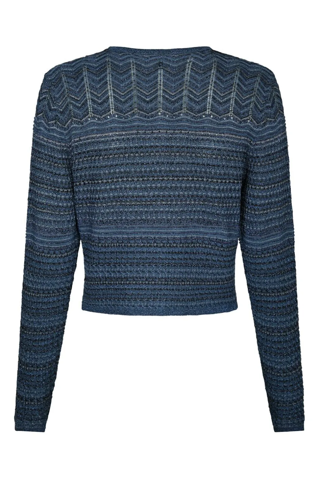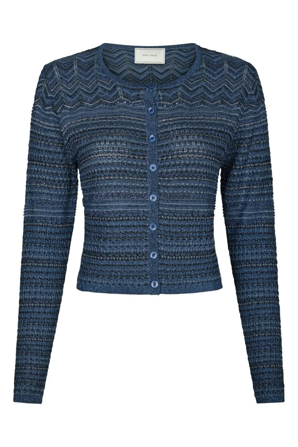 Mørkeblå strikket cardigan fra Neo Noir med chevronmønster. Den har rund hals, knapper foran, og er fremstillet i en blød viskoseblanding med skinnende overflade.