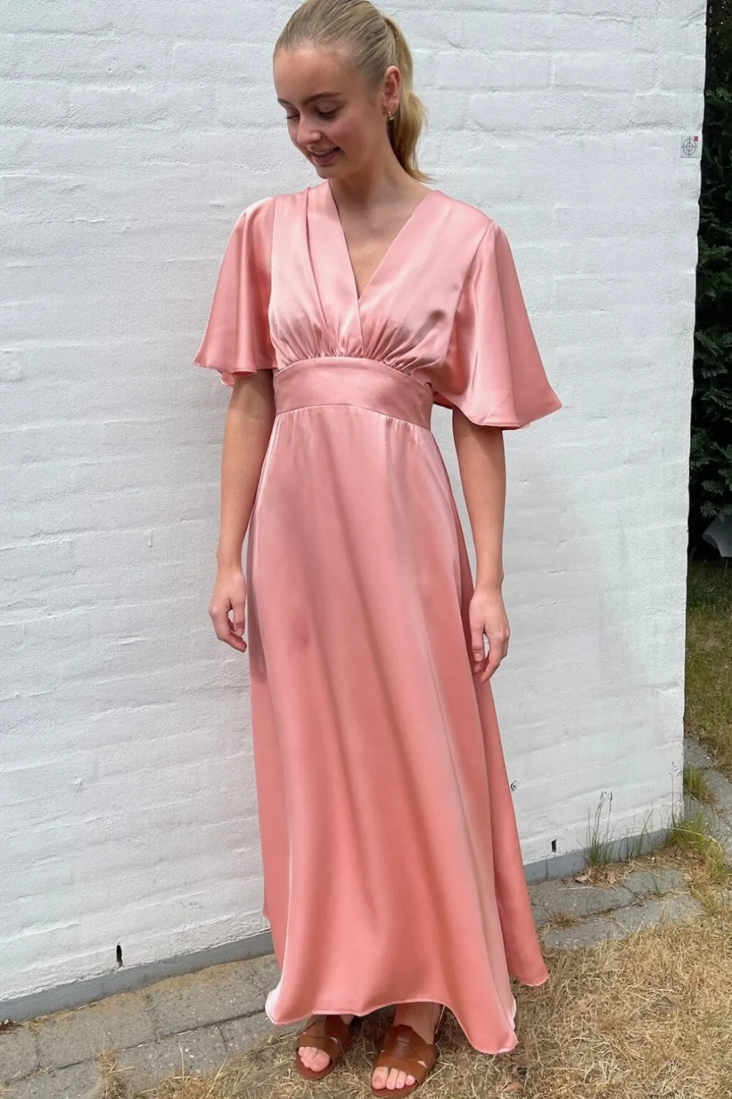Lang kjole fra Sisters Point i en skinnende koralfarve. Kjolen har en v-udskæring og brede flæseærmer, der giver den et let og luftigt udtryk.