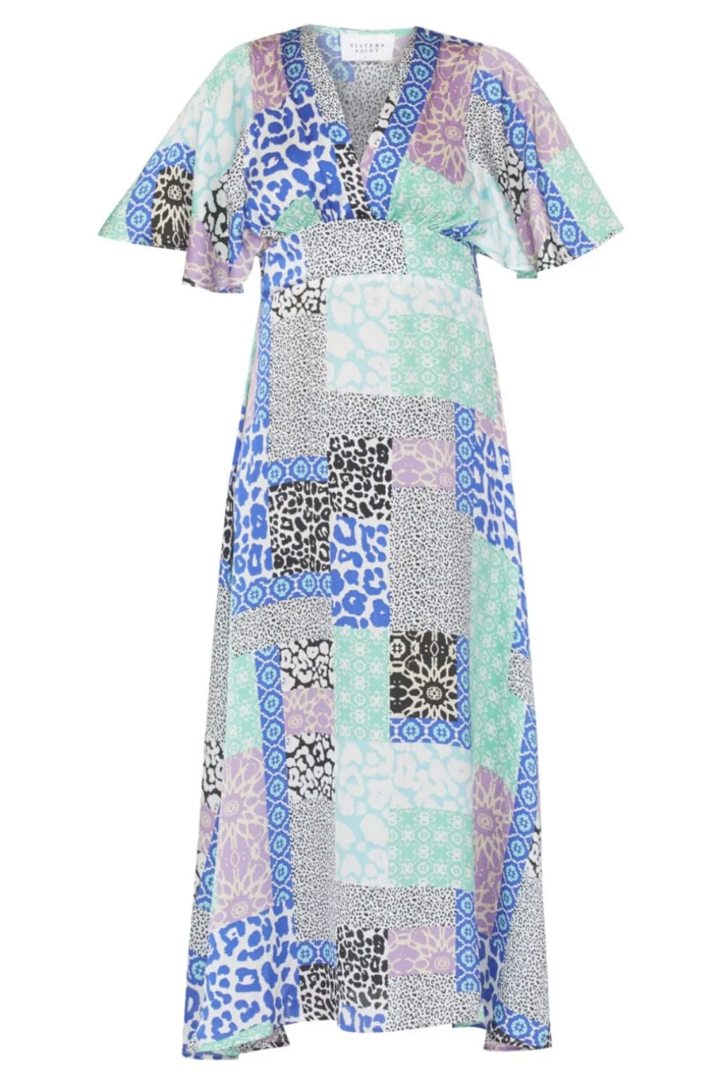 Lang kjole fra Sisters Point med patchworkmønster i blå, mint og lilla nuancer. Kjolen kombinerer leopard- og blomsterprint med en v-udskæring og løse ærmer.