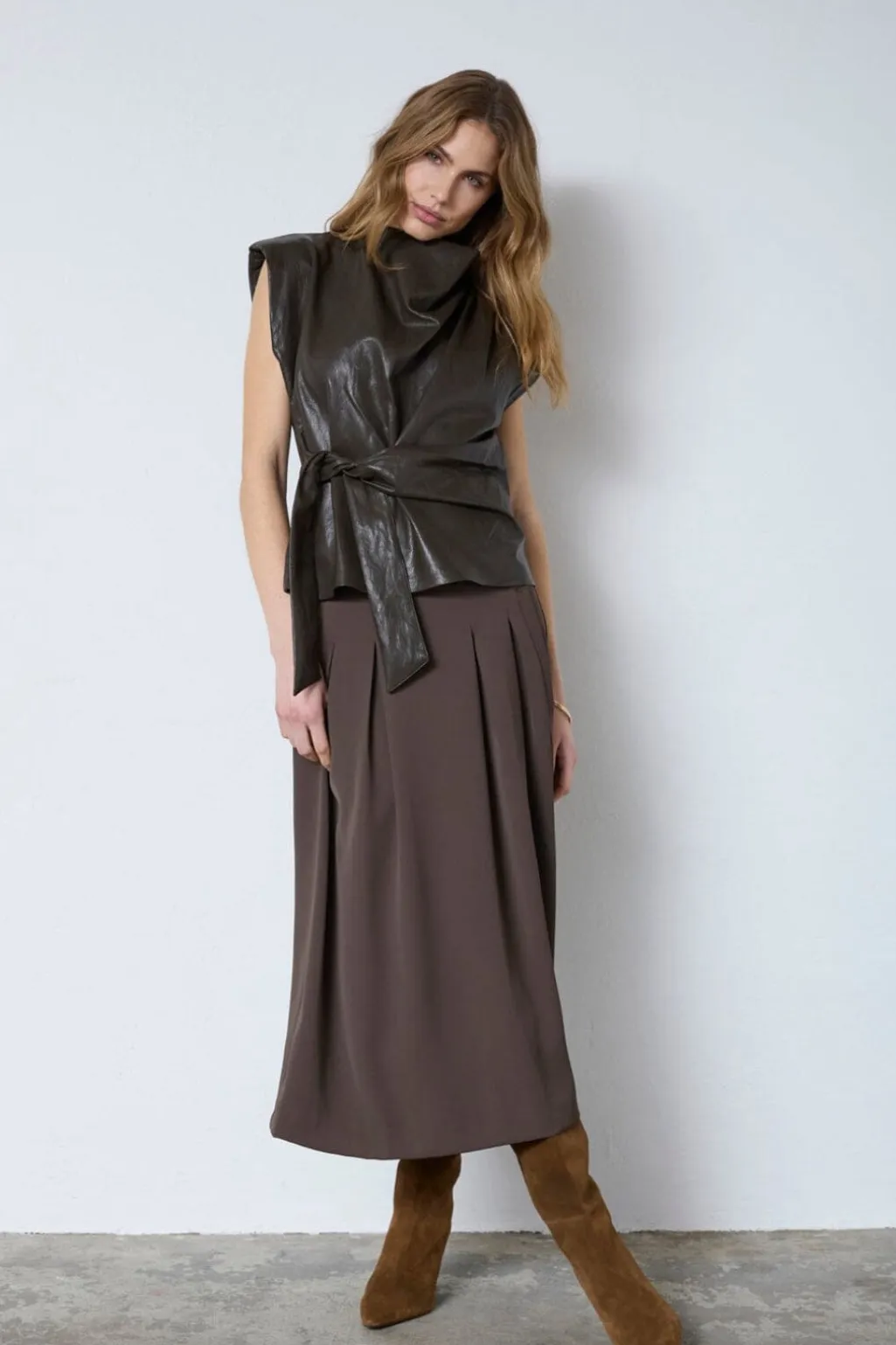 Ærmeløs top fra Co’Couture i mørkebrun. Toppen har en høj halsudskæring og bindebåndsdetaljer i taljen med et draperet design.