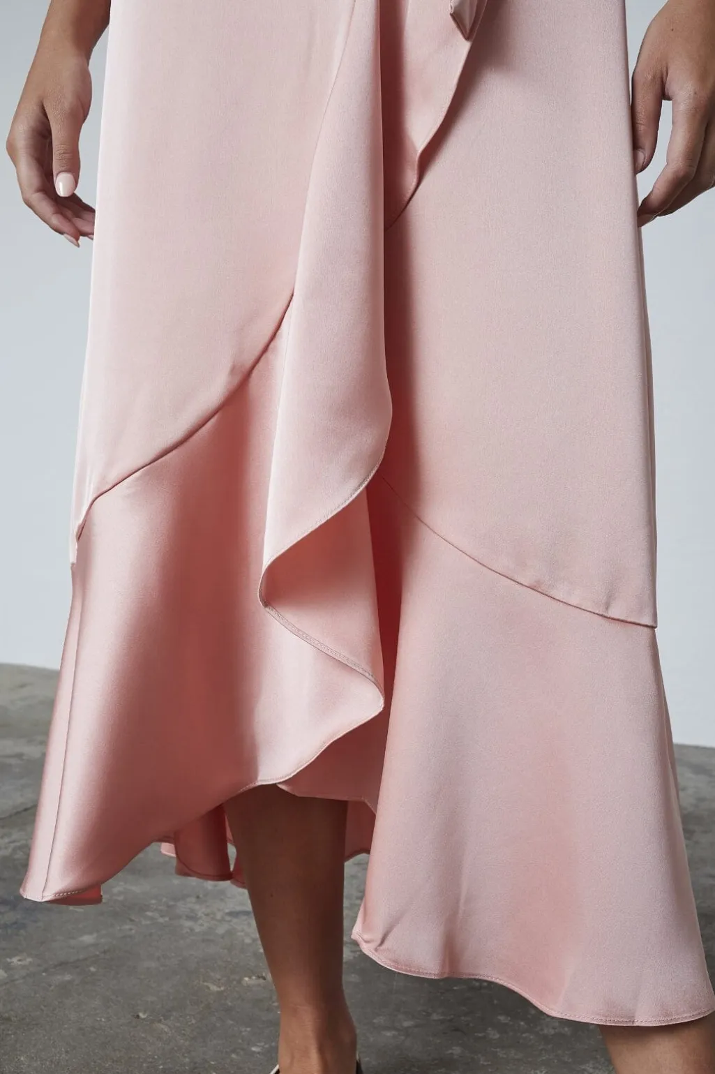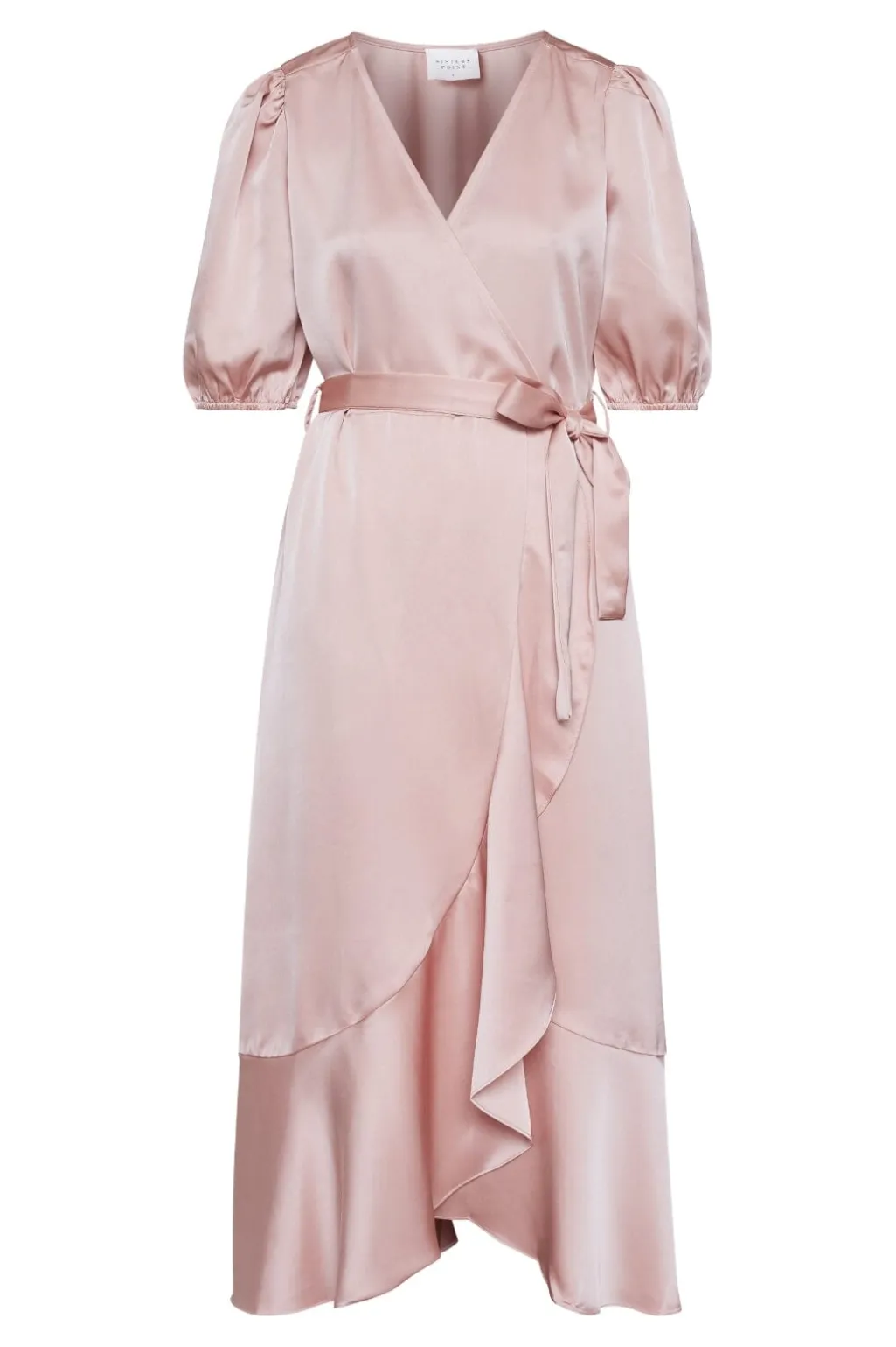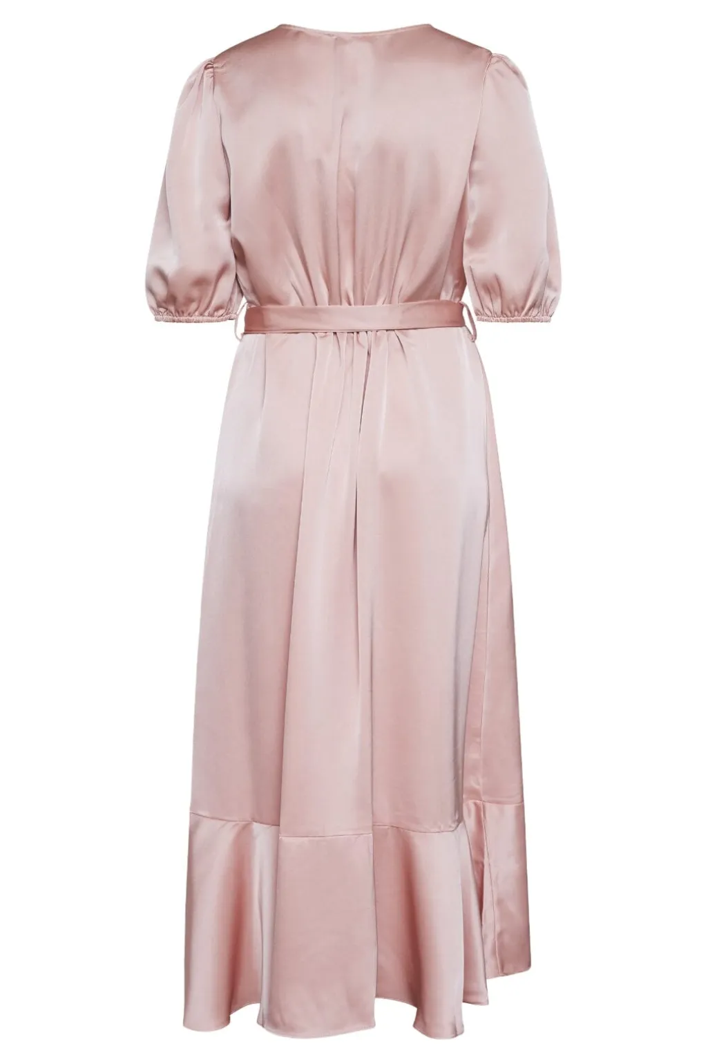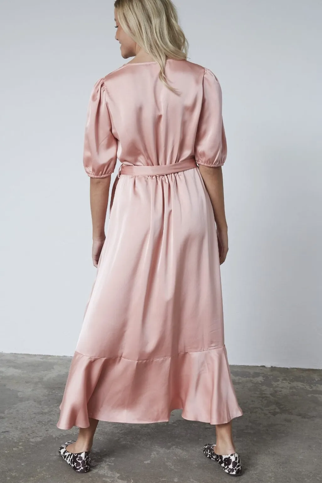 Slå-om-kjole fra Sisters Point i koralfarvet satin med pufærmer. Kjolen har et wrap-design med bindebånd i taljen og en flydende nederdel med flæsekant.