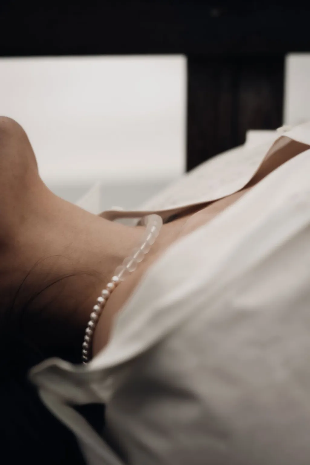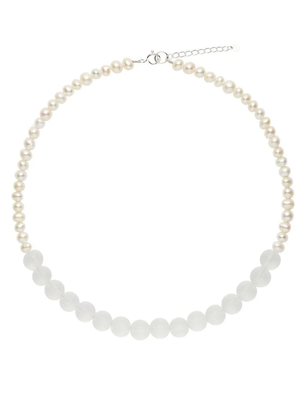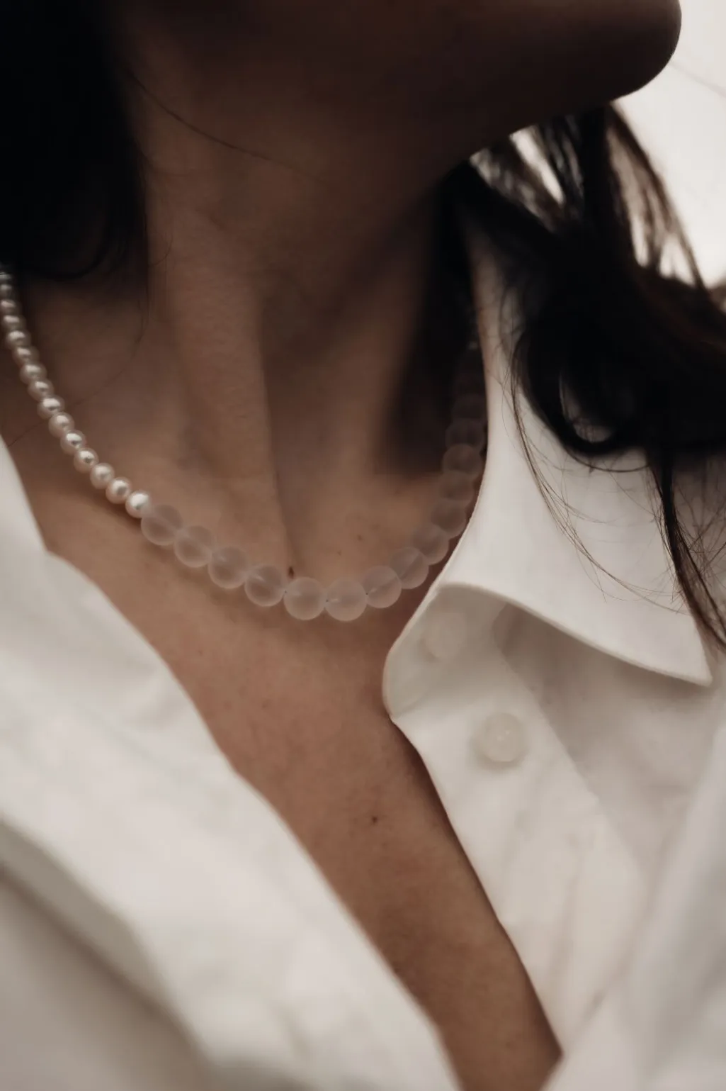 Håndlavet halskæde fra Sorelle Jewellery, fremstillet på et dansk værksted. Kombinationen af ferskvandsperler og bjergkrystal skaber en fin balance mellem matte og blanke perler.