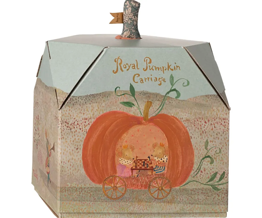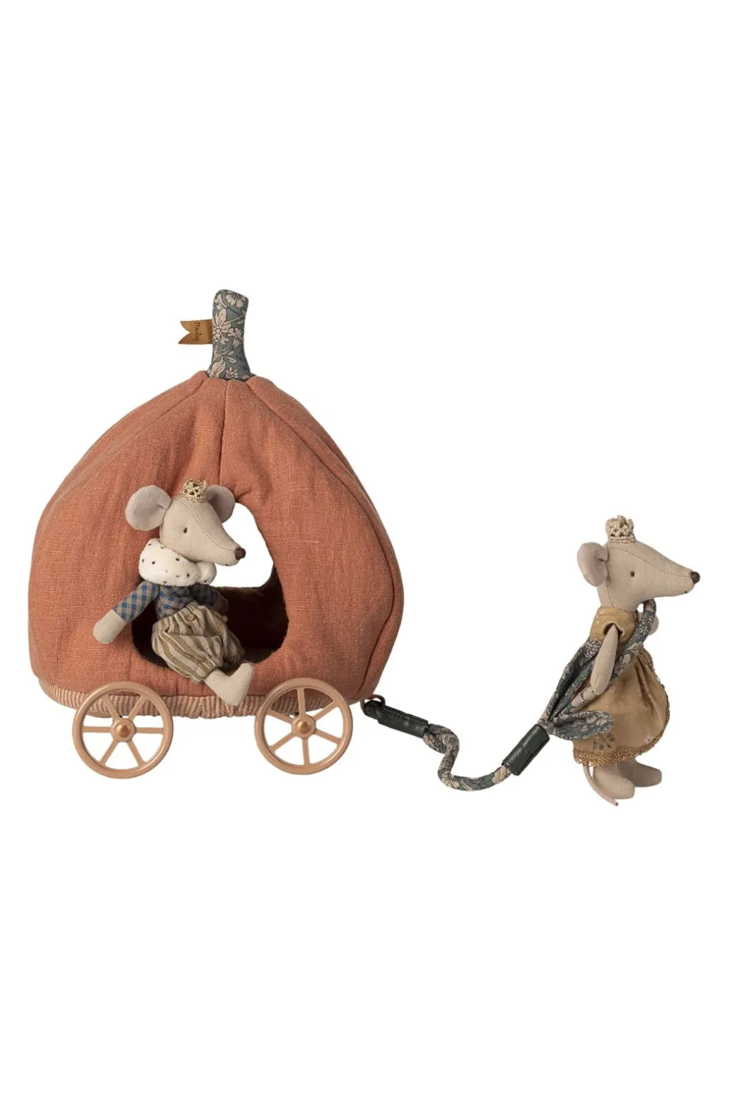 En græskarformet vogn fra Maileg til musefigurer. Vognen har fire hjul og en træksnor med blomstermønster, der gør det muligt at trække vognen rundt.