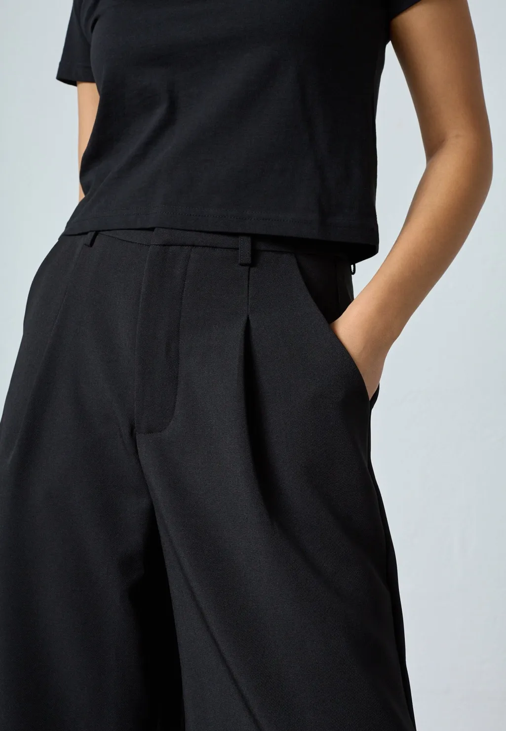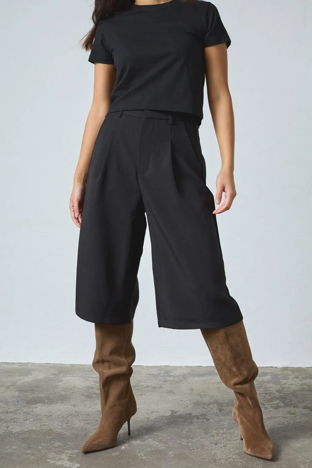 Sorte culotte-shorts fra Sisters Point med løs pasform og knælængde. Shortsene har høj talje og læg foran.