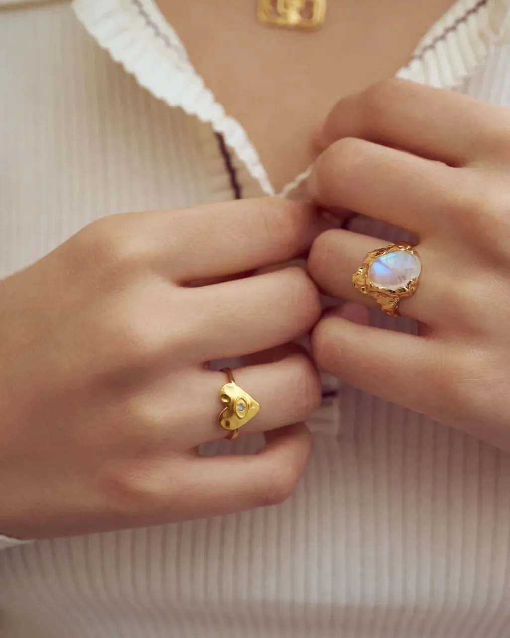 Ring fra Maanesten med oval månesten i hvid. Den teksturerede guldoverflade omkranser stenen og giver ringen et kunstnerisk udtryk med sine organiske former.