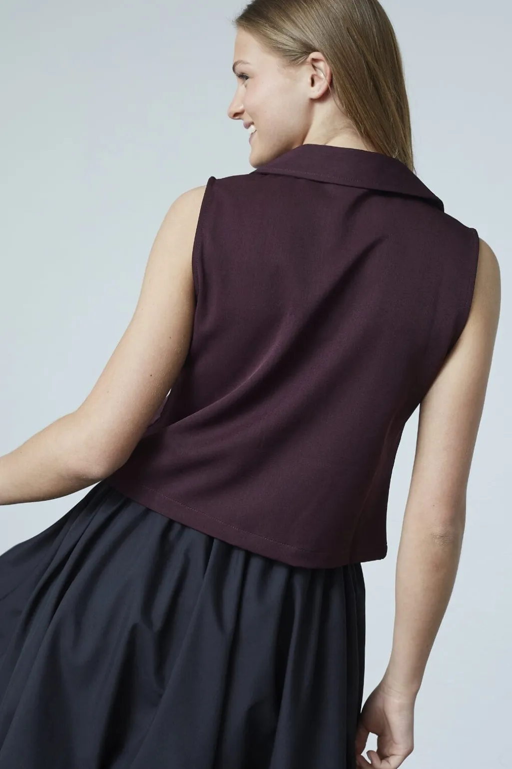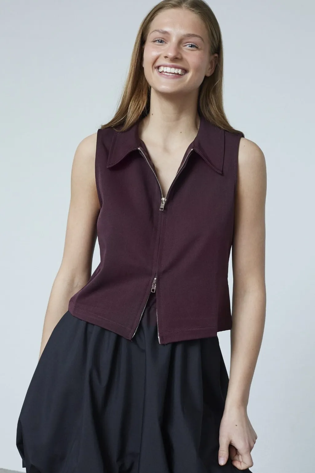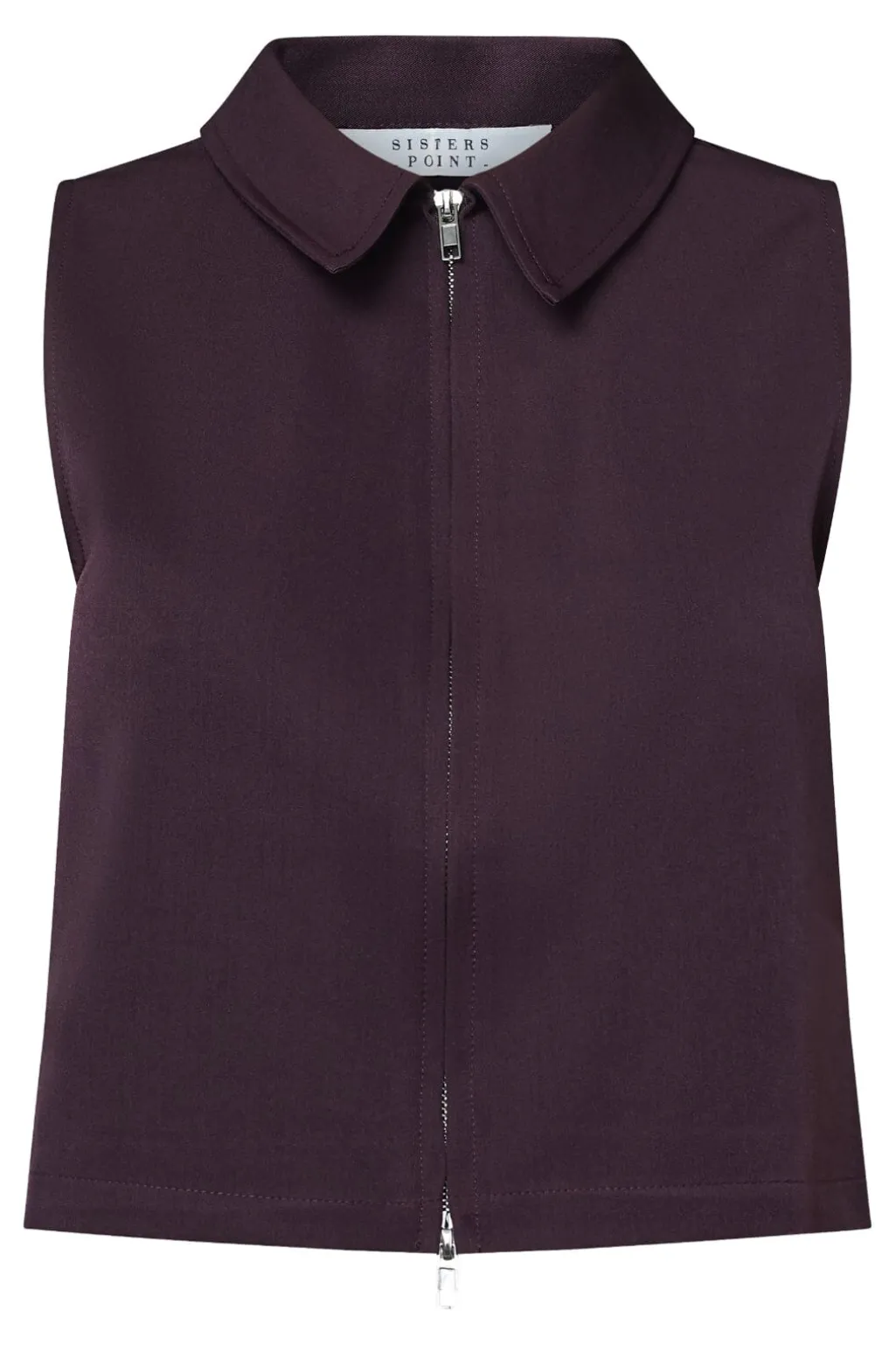 Ærmeløs top fra Sisters Point i bordeaux. Den har skjortekrave, lynlåslukning foran og en tætsiddende pasform, der fremhæver kroppens linjer.