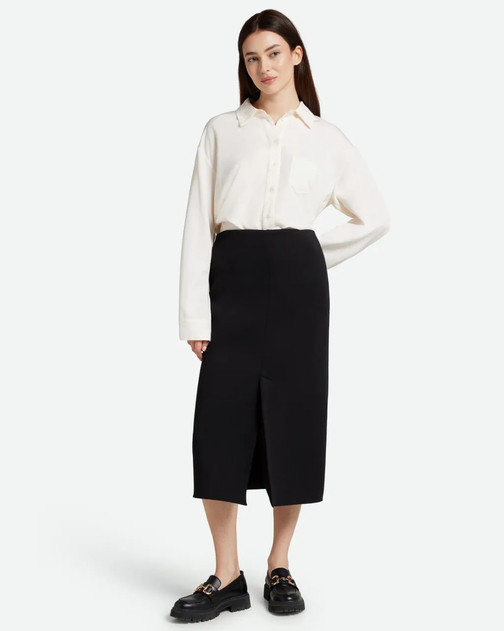 Sort nederdel fra Moves By Minimum i kalvelængde med lige silhuet og frontslid. Den enkle stil passer til både kontoret og festlige lejligheder.