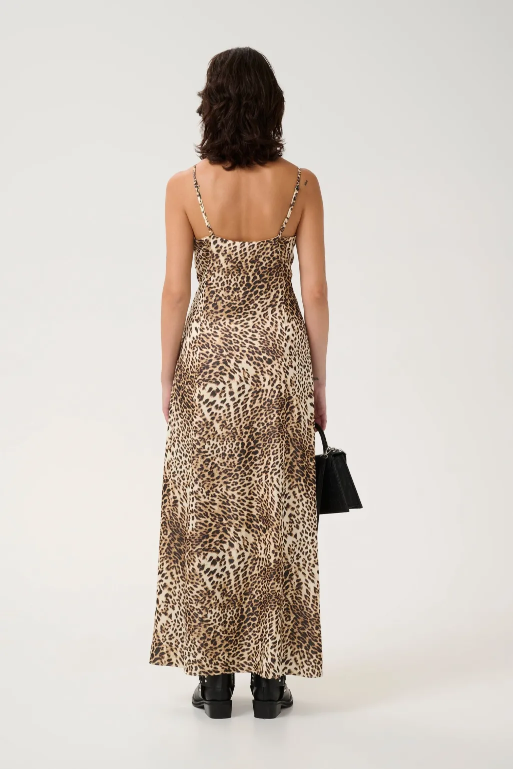 Ankellang kjole fra Gestuz med et lyst leopardprint. Kjolen har en V-udskæring, justerbare spaghetti-stropper og en sideslids, der giver god bevægelighed.