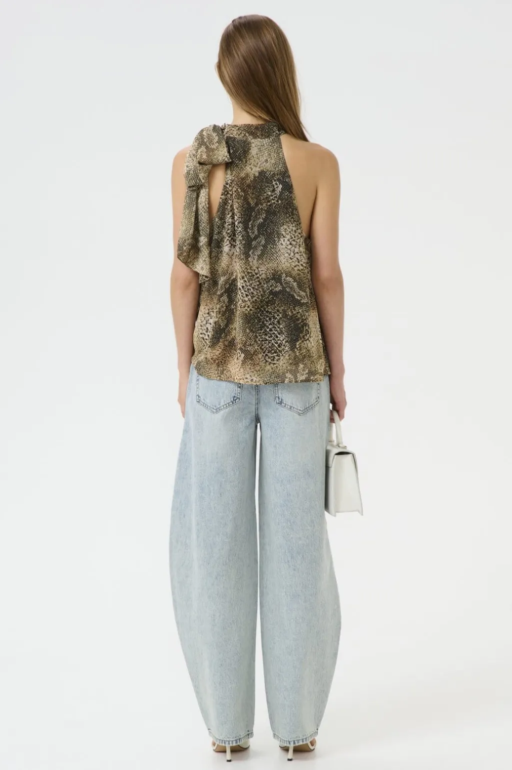 Ærmeløs top fra Gestuz med slangeprint i guld og brun. Toppen har en asymmetrisk udformning med sløjfedetalje ved skulderen og høj hals.