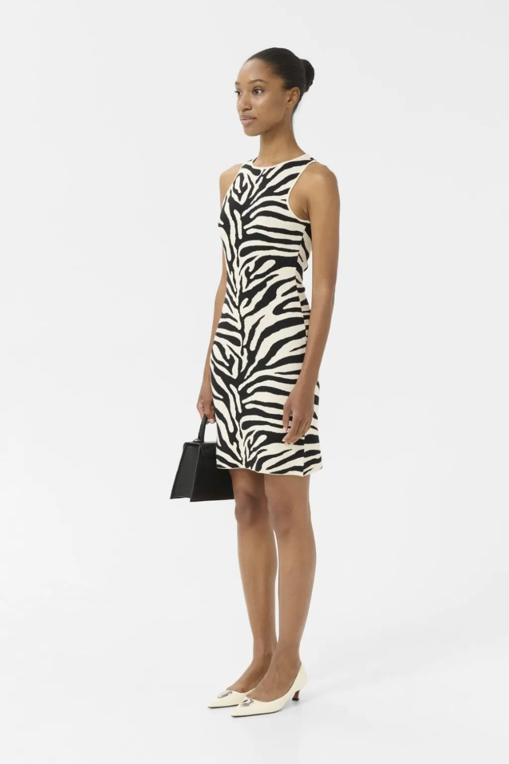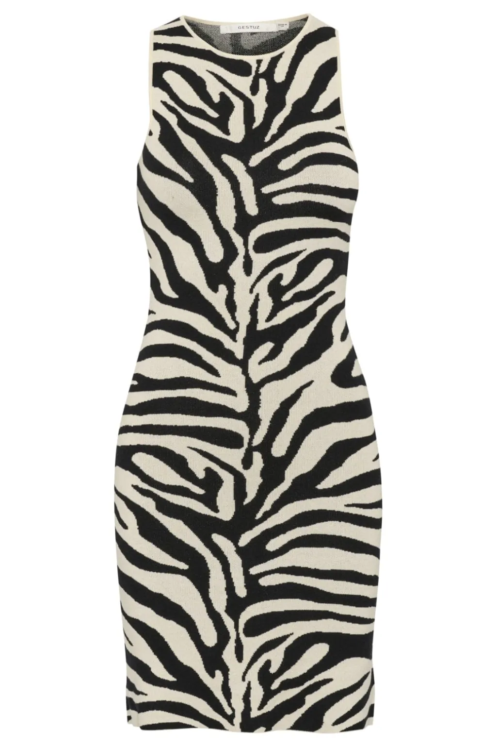 Ærmeløs kjole fra Gestuz med zebraprint i sort og birch. Den har en rund halsudskæring og en lige silhuet, der går til midt på låret.