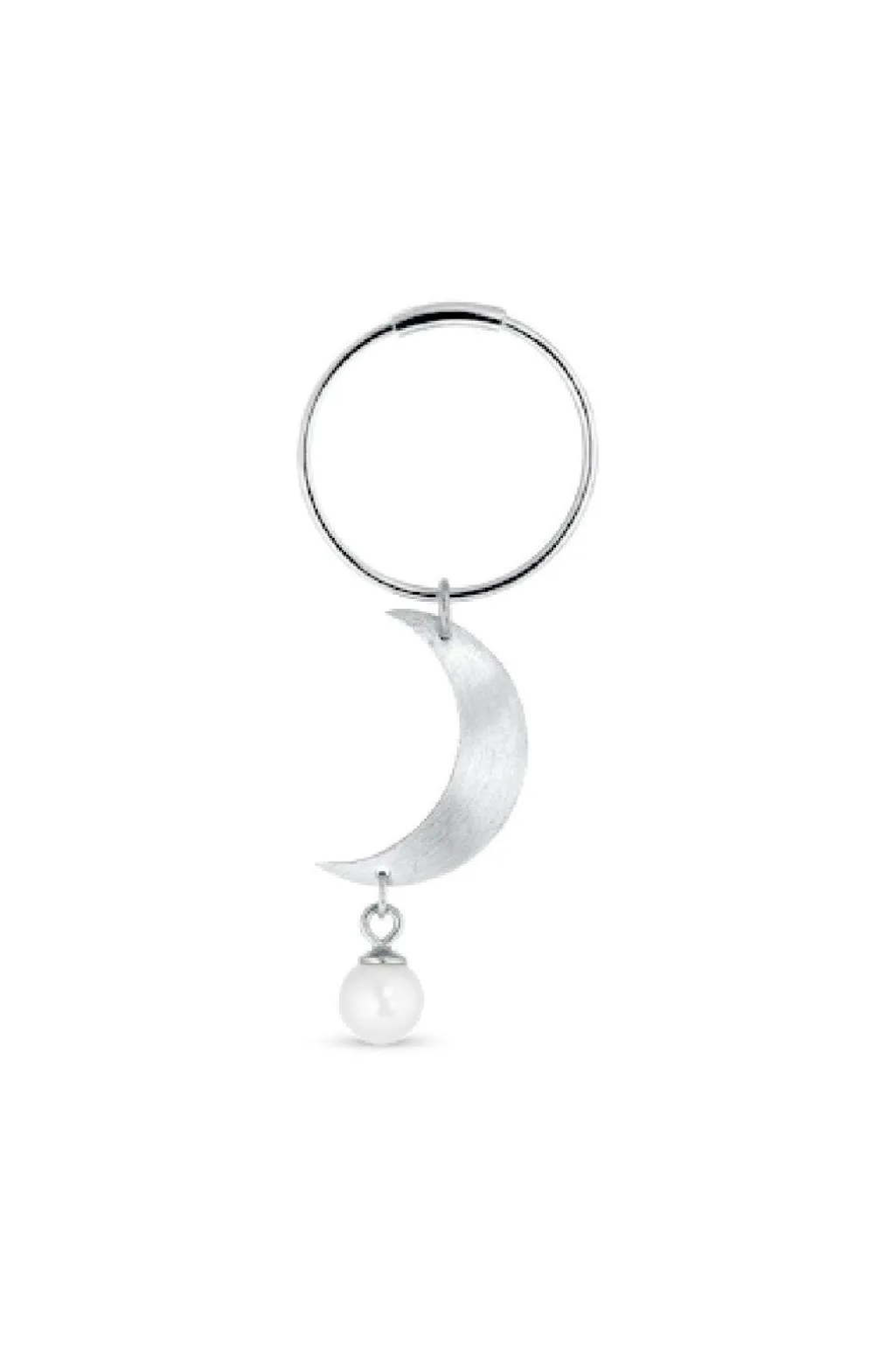 Sølvcreole fra Jane Kønig med en halvmåneform og en perle. Øreringen er lavet i sterling sølv med en cirkulær ring og en perle, der hænger fra månen.