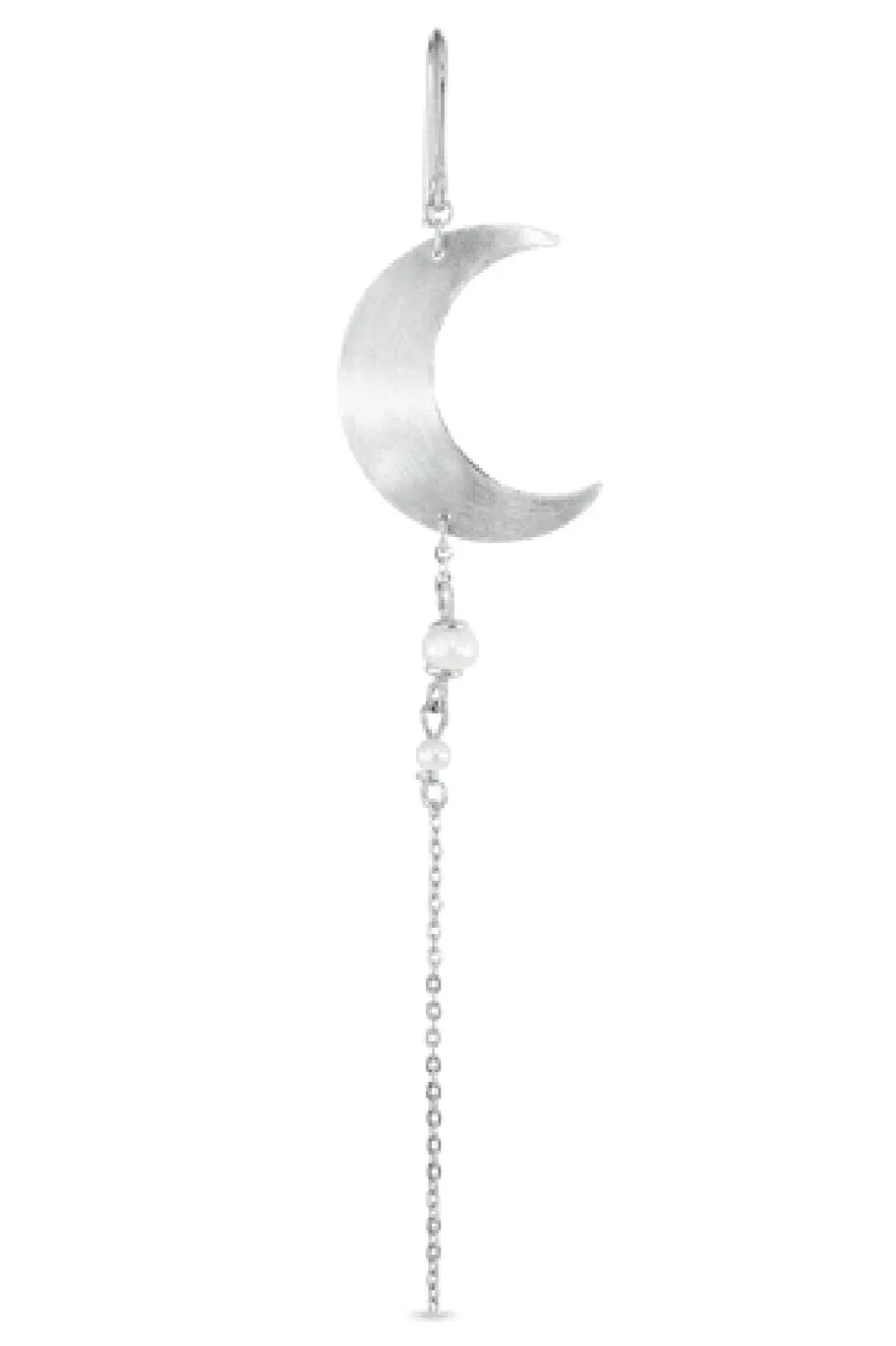 Sølvørering fra Jane Kønig med halvmåneform og perlekæde. Den blanke månefigur er kombineret med en fin kæde af perler, der giver øreringen et let og dynamisk udtryk.