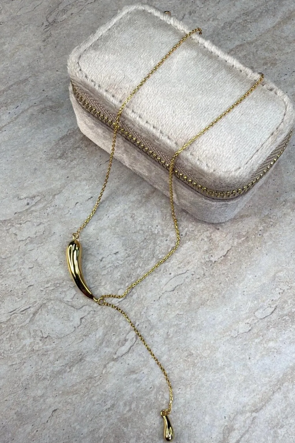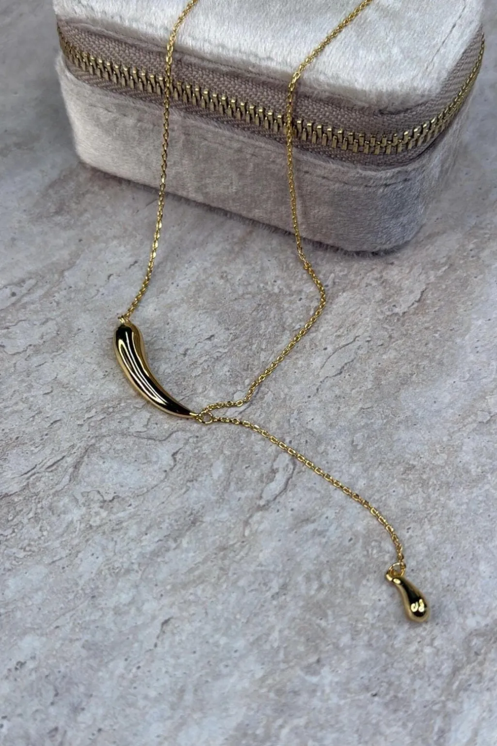 Forgyldt halskæde fra Molly&My Jewellery med et dråbeformet vedhæng. Kæden har en tynd og delikat konstruktion med en skinnende, gylden overflade.