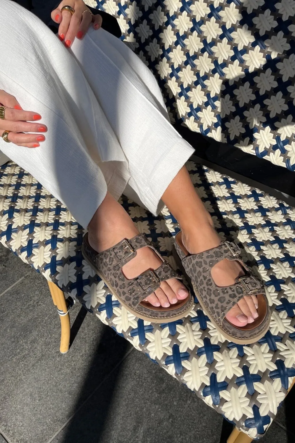 Sandaler fra Copenhagen Shoes i læder med leopardprint. Den grå-brune Lep Taupe-farve har et trendy dyreprint og to praktiske spænder til lukning.