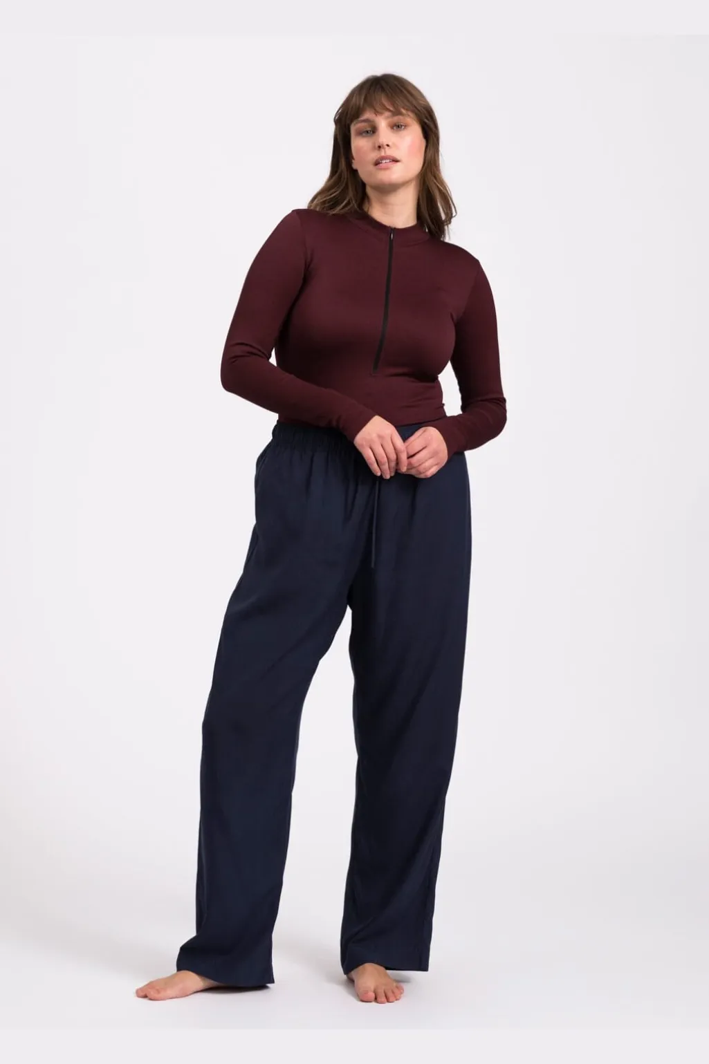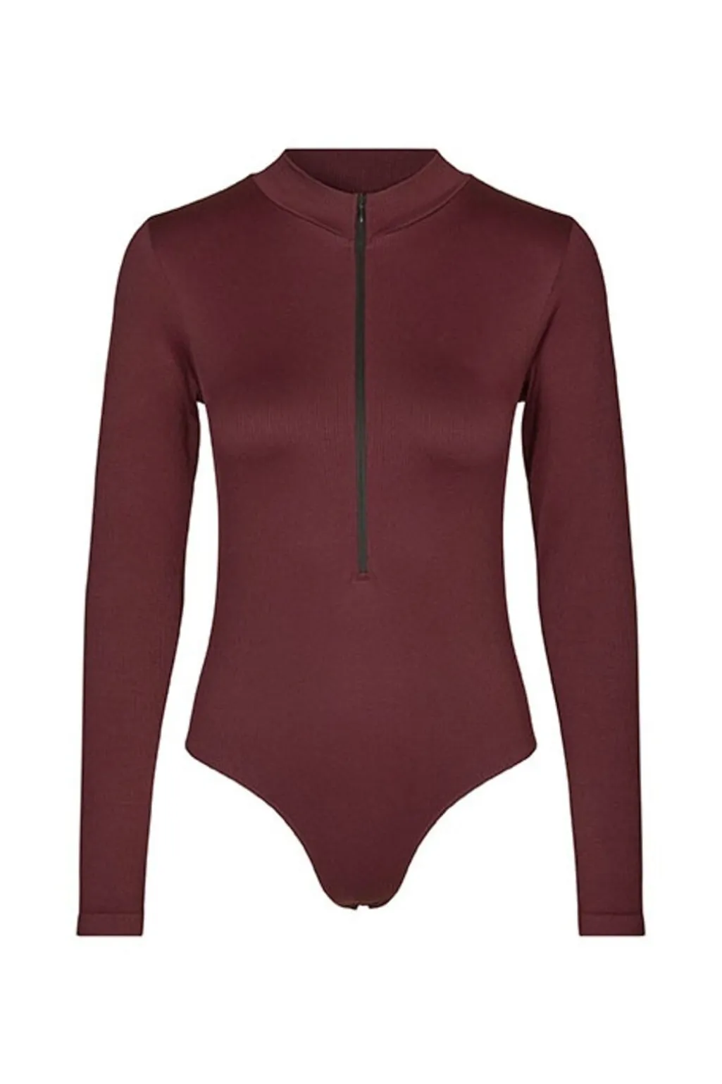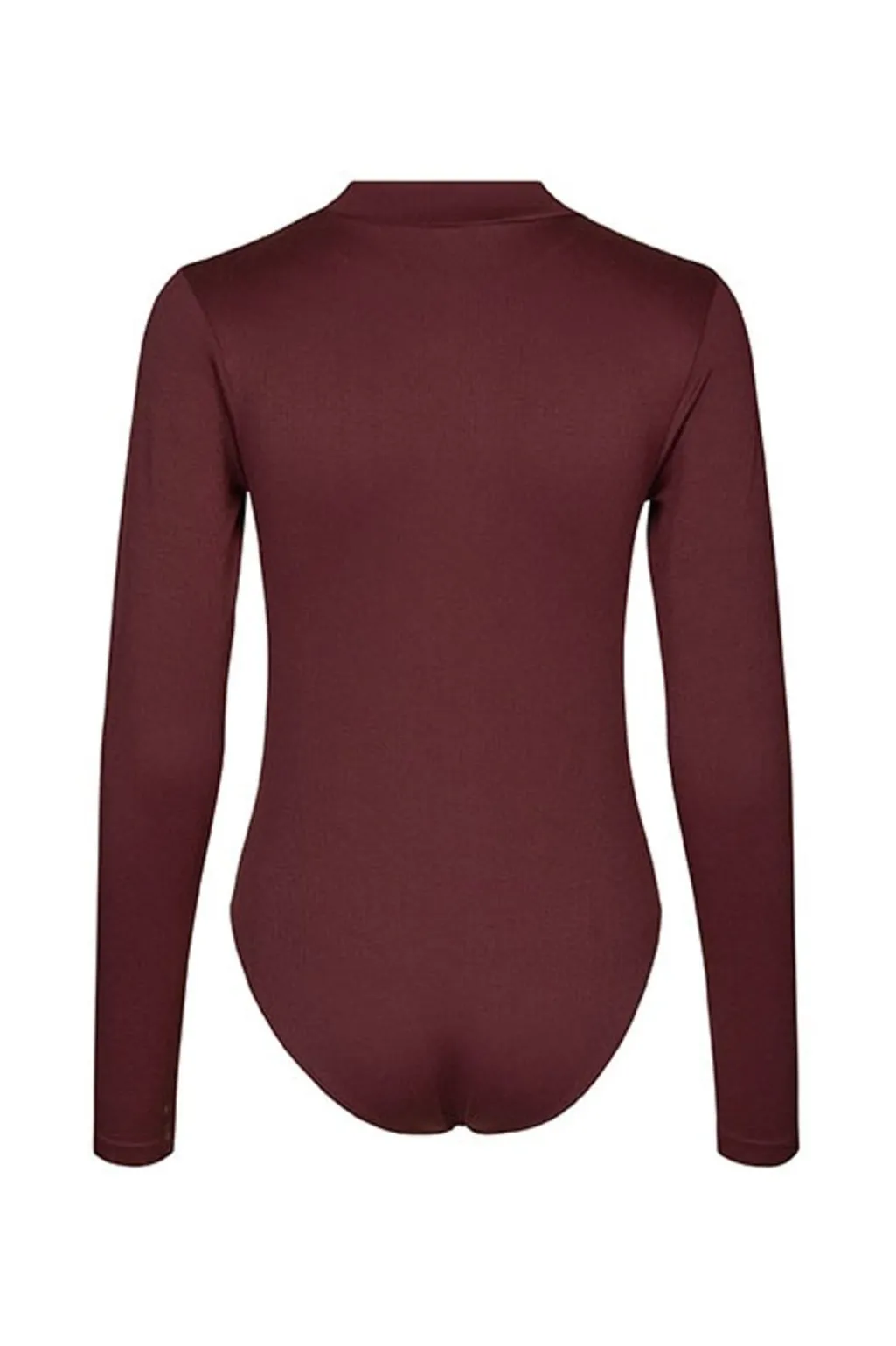Vinrød bodystocking fra Lykkeland Ateliér med høj hals og lynlås foran. Den tætsiddende model har lange ærmer og er lavet i et strækbart materiale, der følger kroppens bevægelser.