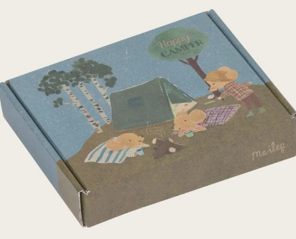 Et legetelt fra Maileg i militærgrøn farve. Teltet er lavet til at skabe en hyggelig base for leg med Maileg-mus og andre små figurer.