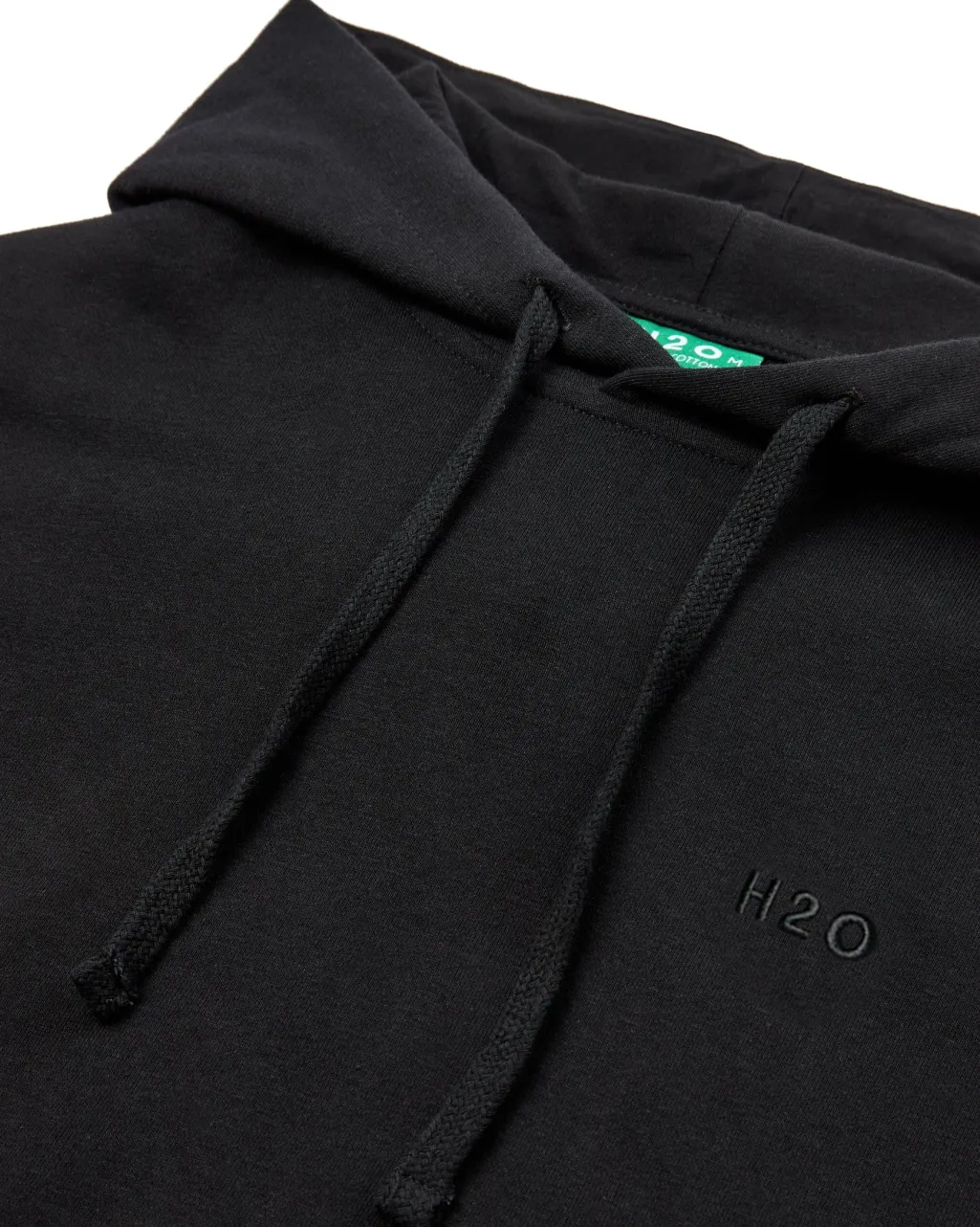 Sort hættetrøje fra H2O med broderet logo på brystet. En alsidig sweatshirt, der kan bruges til både træning og afslapning, med praktiske detaljer som snøre i hætten og ribkanter ved ærmer og søm.