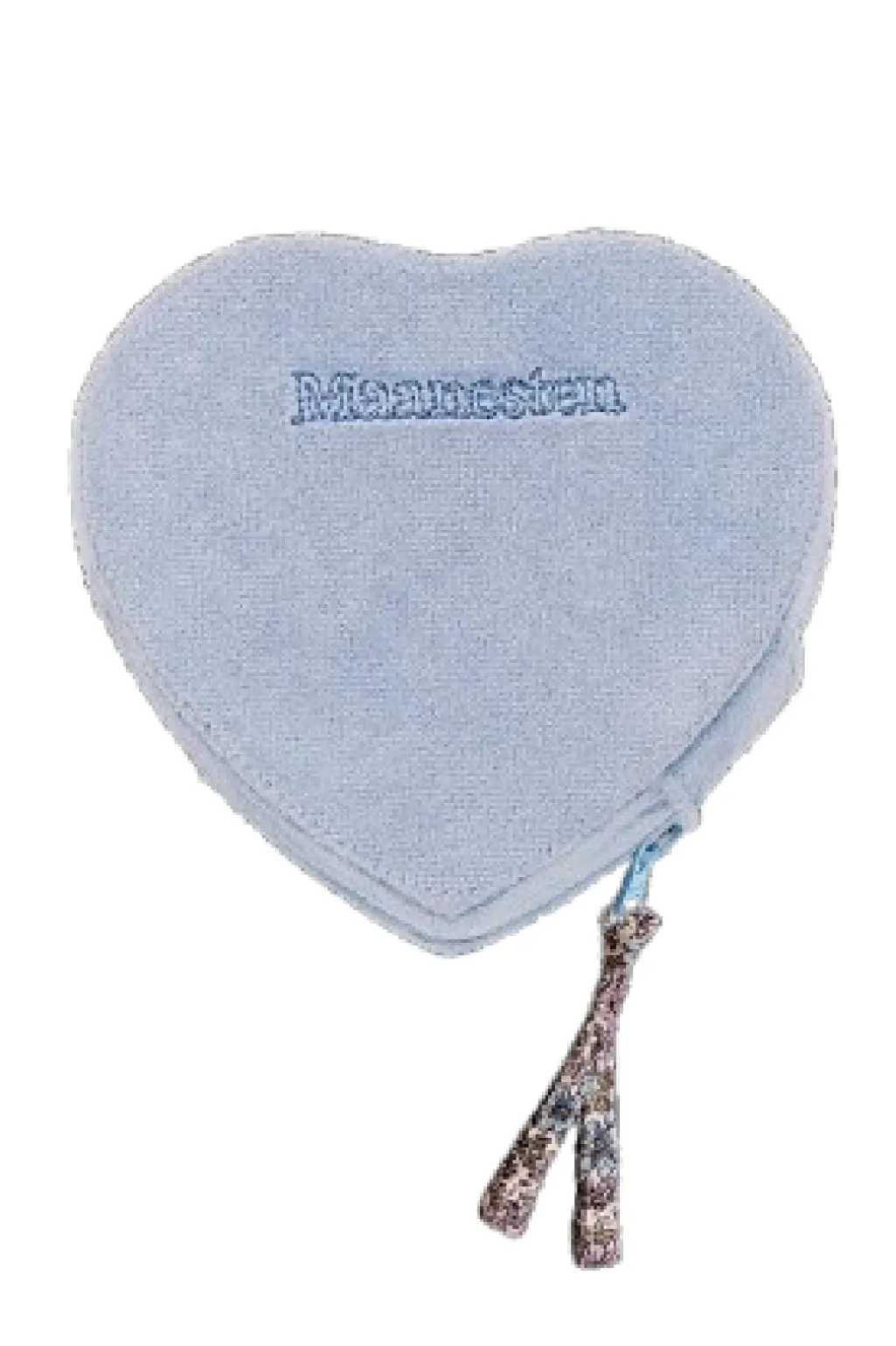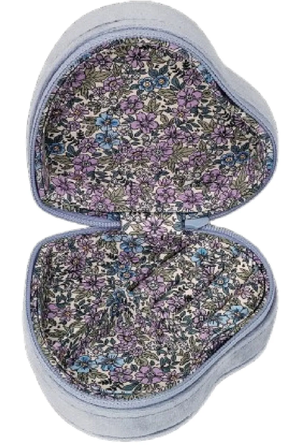 Himmelblå smykkeæske i hjerteform fra Maanesten med broderet Moonchild-tekst på forsiden. Indersiden har et blomstermønster i lilla og blå nuancer.