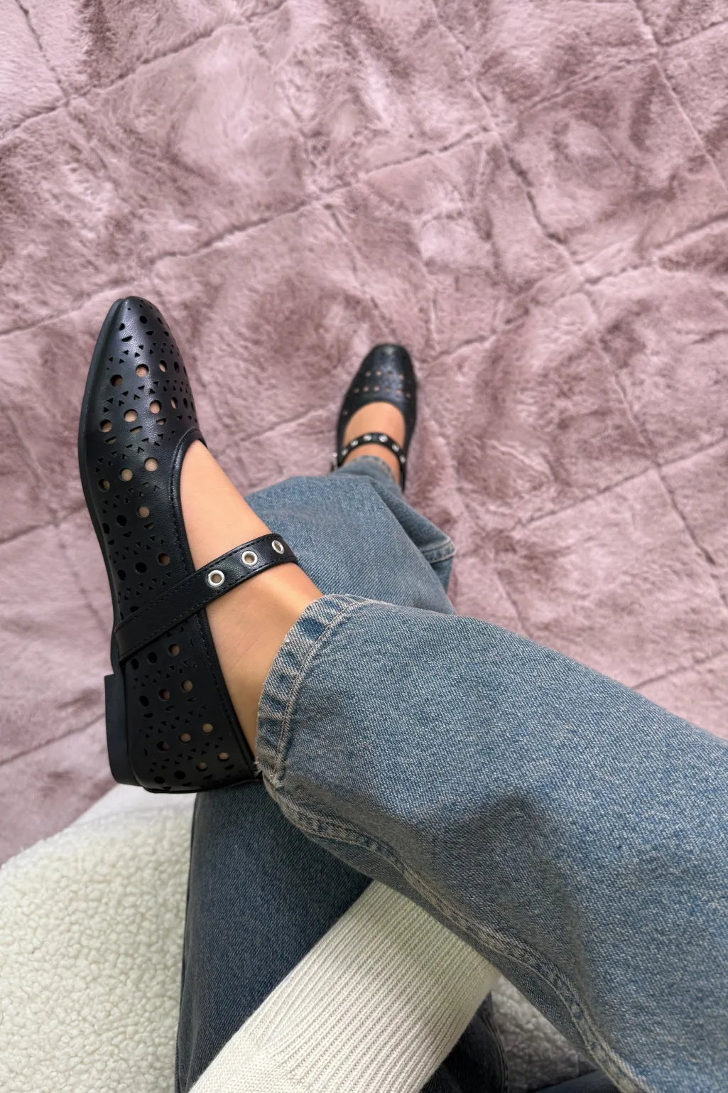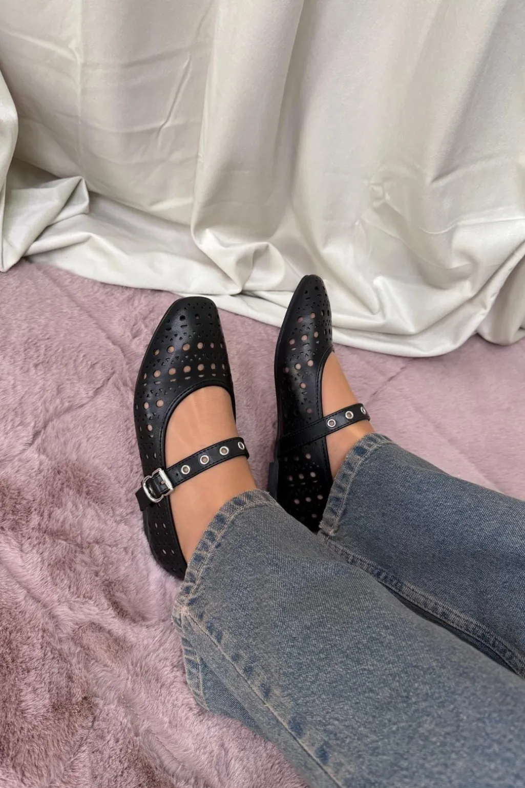 Sorte sko fra Bloom med huller i et fint mønster over overdelen. Remmen med spænde går hen over vristen, og den firkantede tå giver skoen sit særpræg.