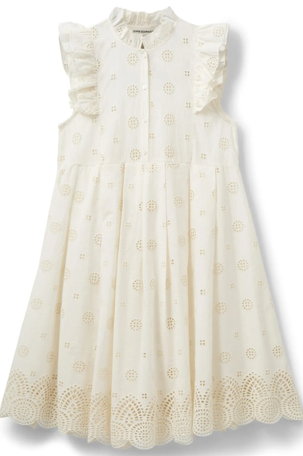 Off-white kjole fra Sofie Schnoor med polkaprikker og blondeudskæringer. Kjolen har høj hals og går til knæene med fine flæsedetaljer langs ærmekanten.