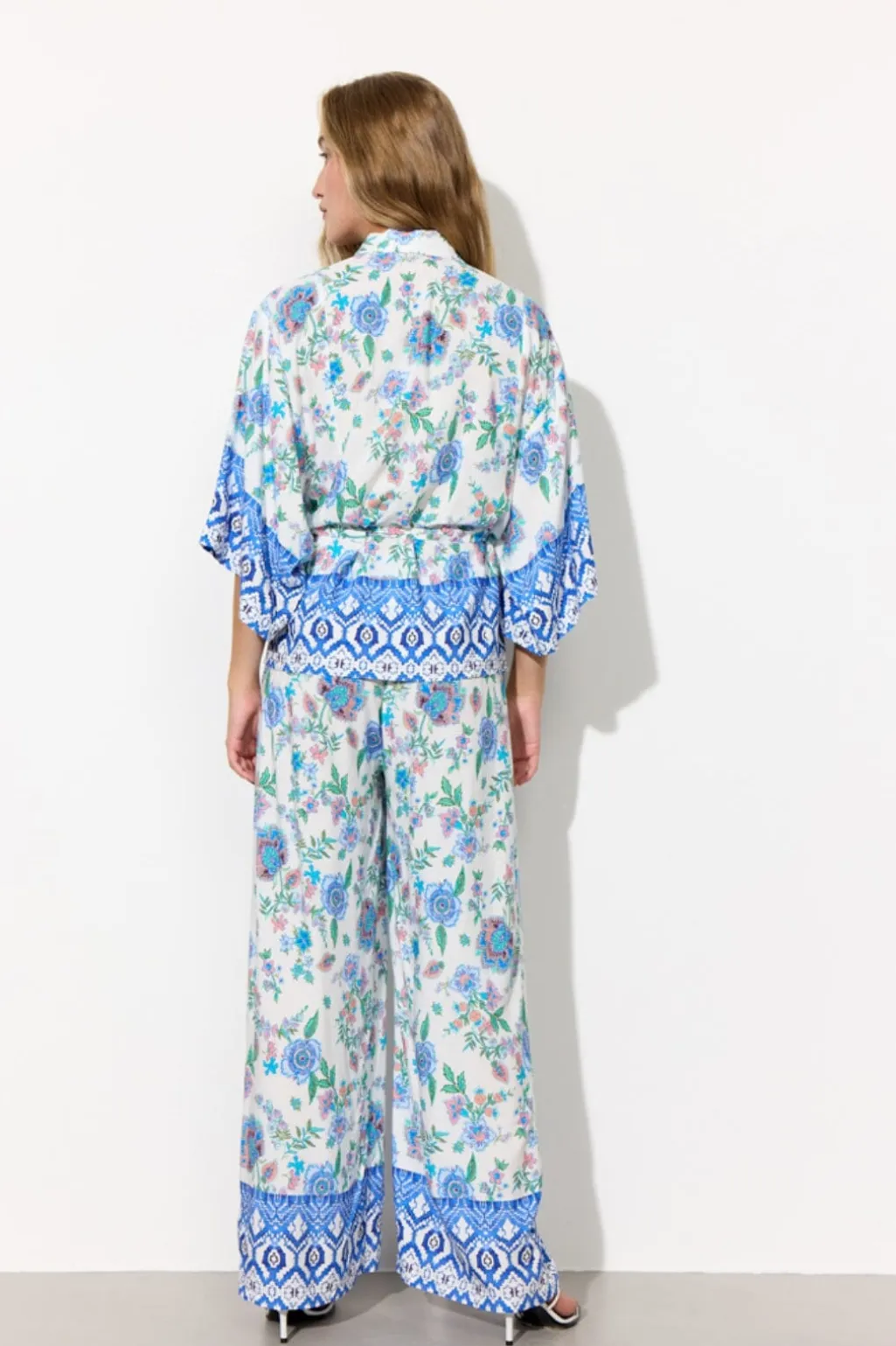 Hvide bukser fra Hunkøn med et blomstermønster i blå, grønne og rosa nuancer. Bukserne har en høj talje med elastik og går ned til gulvet.