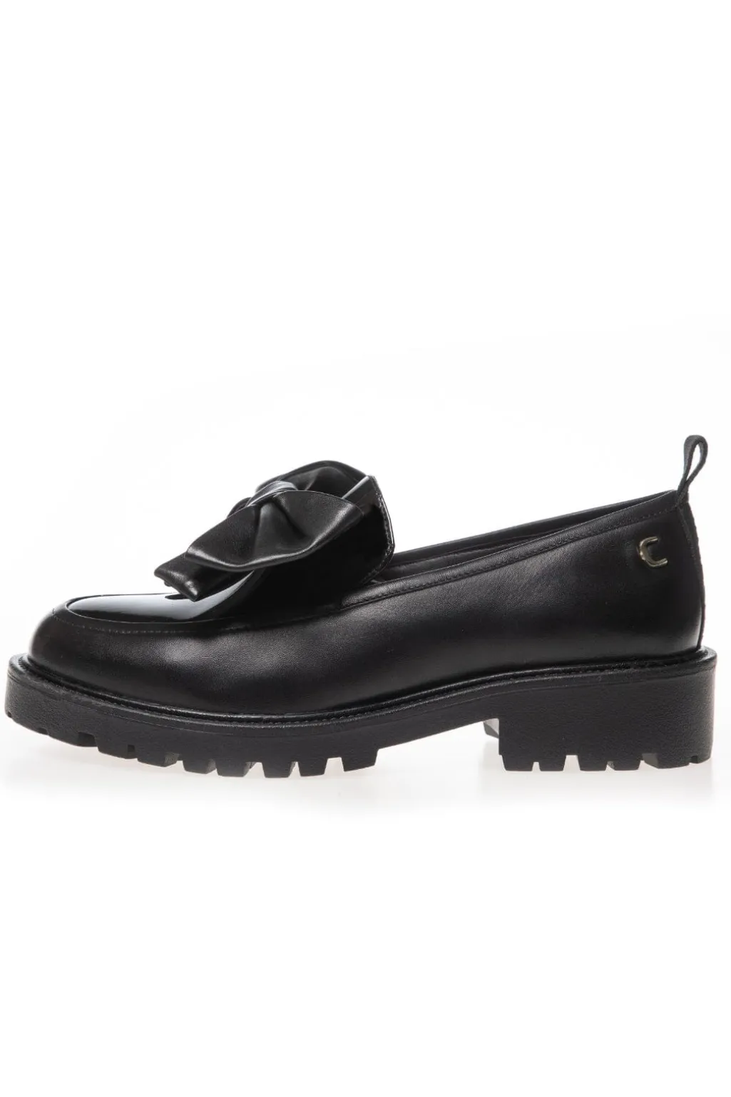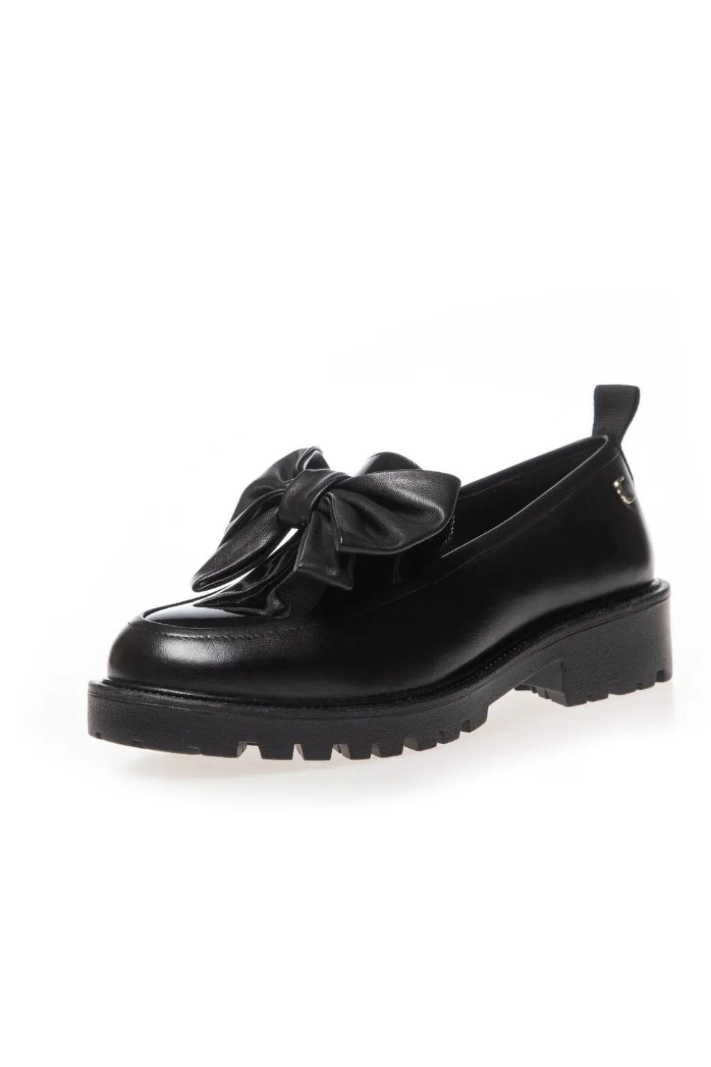 Sorte loafers i læder med en stor sløjfe på oversiden. Skoen har en blank finish og en lav blokhæl, der gør den stabil at gå i.