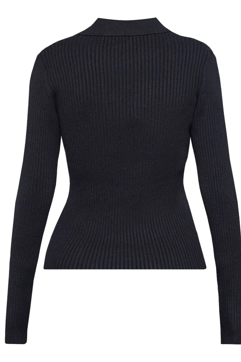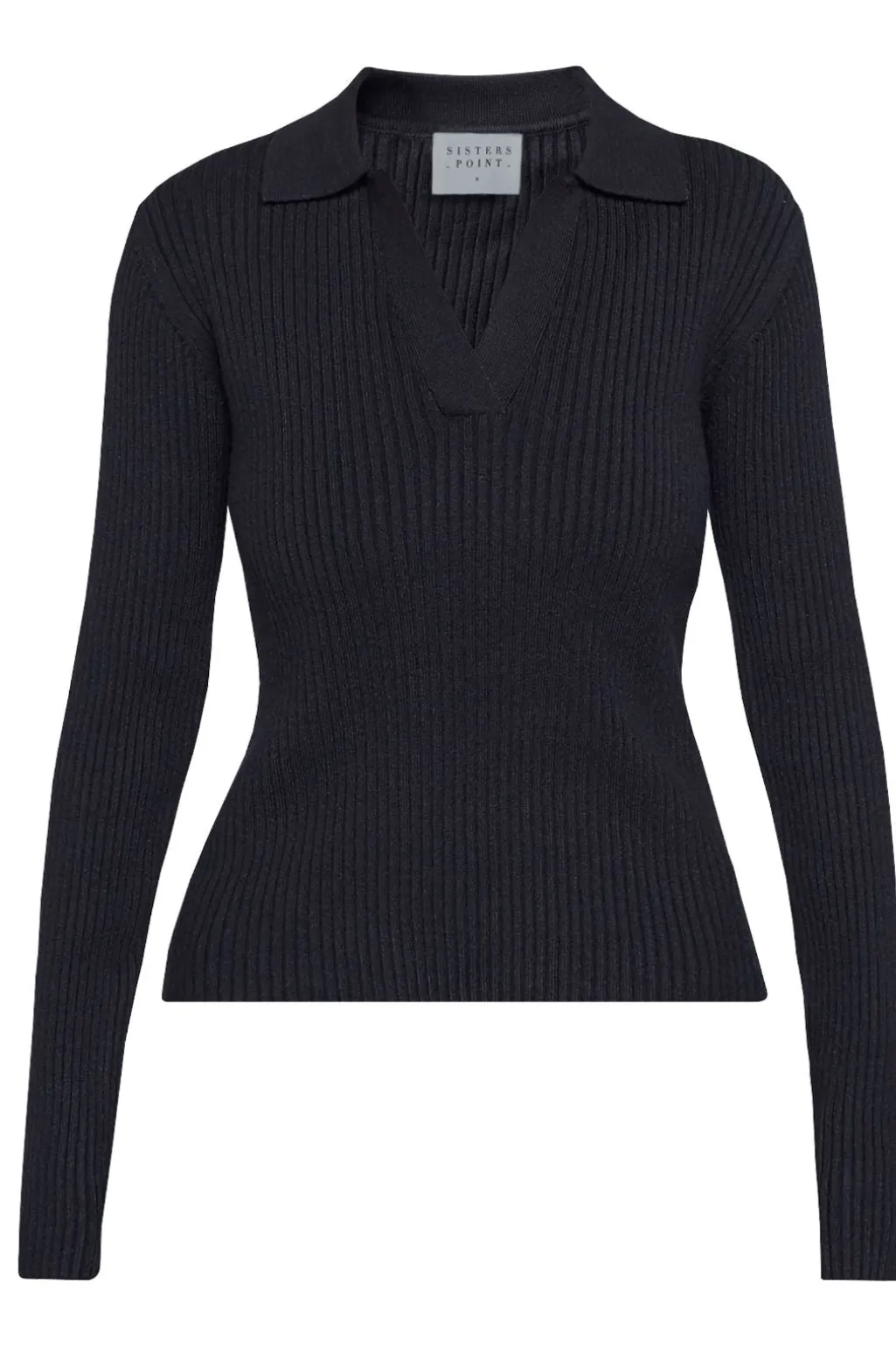 Sort striktrøje fra Sisters Point med en ribstrikket struktur. Trøjen har en klassisk polokrave kombineret med en V-udskæring.
