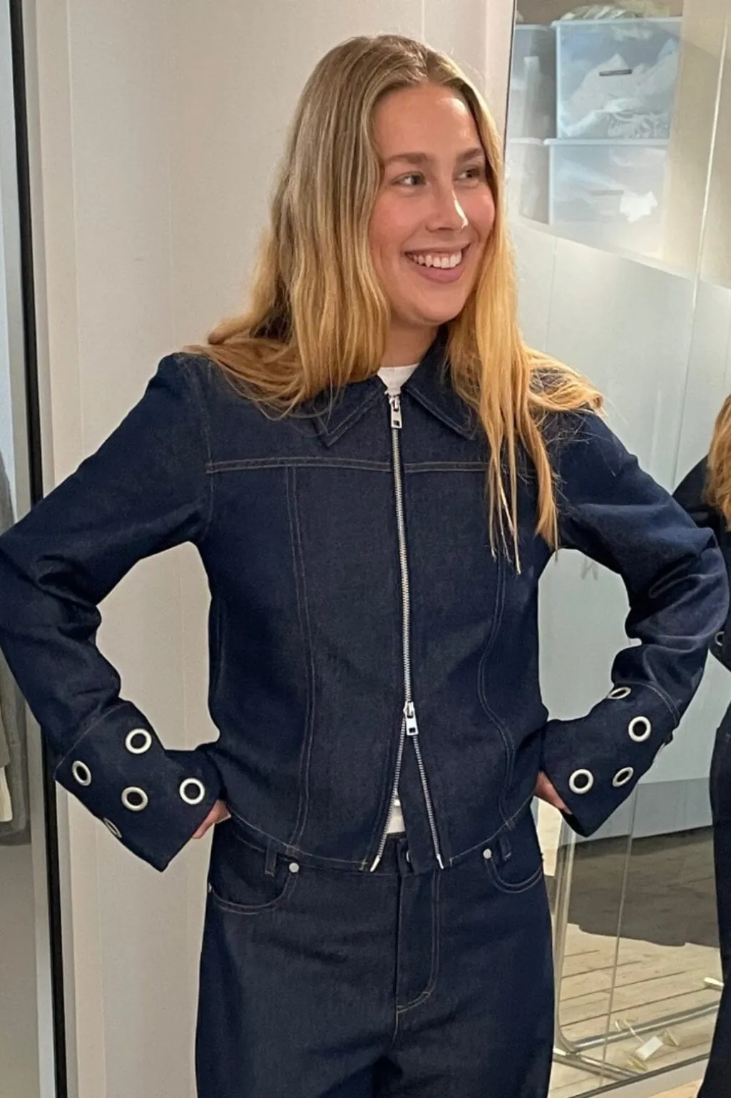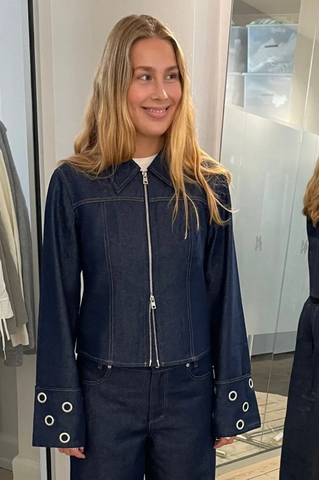 Mørkeblå denimjakke fra MbyM med skjortekrave og lynlåslukning. Jakken har lange ærmer med øjeringe og en praktisk frontlynlås, der giver nem adgang.