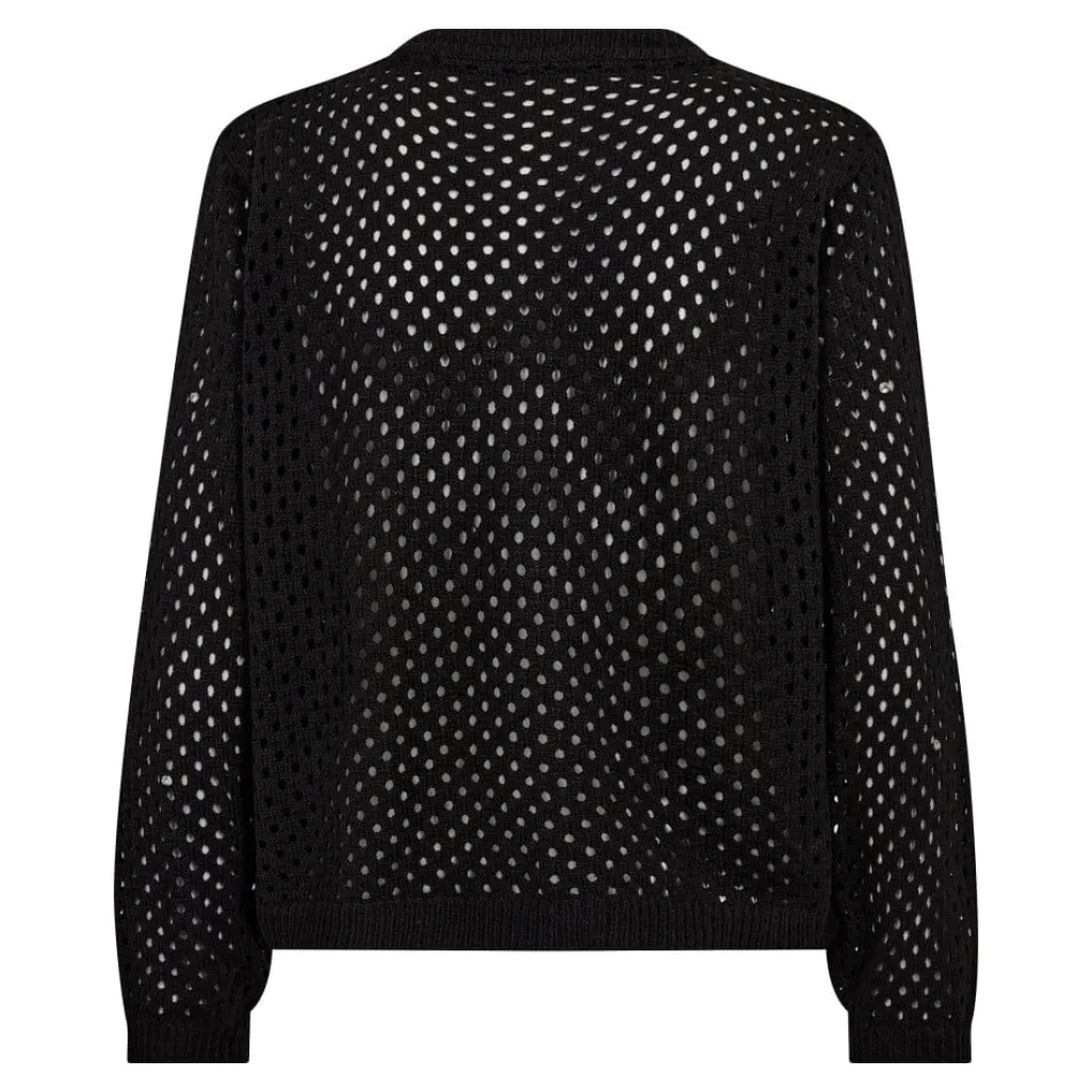 Sort cardigan fra Co’Couture med et gennemsigtigt mesh-mønster. Cardiganen har krystal-lignende knapper og pailletter, der giver et festligt udtryk.