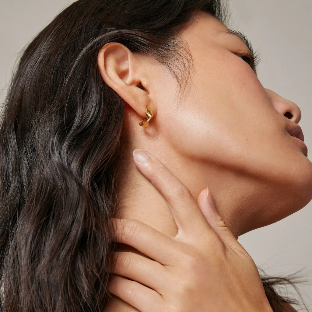 Guldfarvede creoler fra Enamel Copenhagen med en buet og abstrakt form. Øreringene er lavet af guldbelagt sterling sølv med en mat overflade.