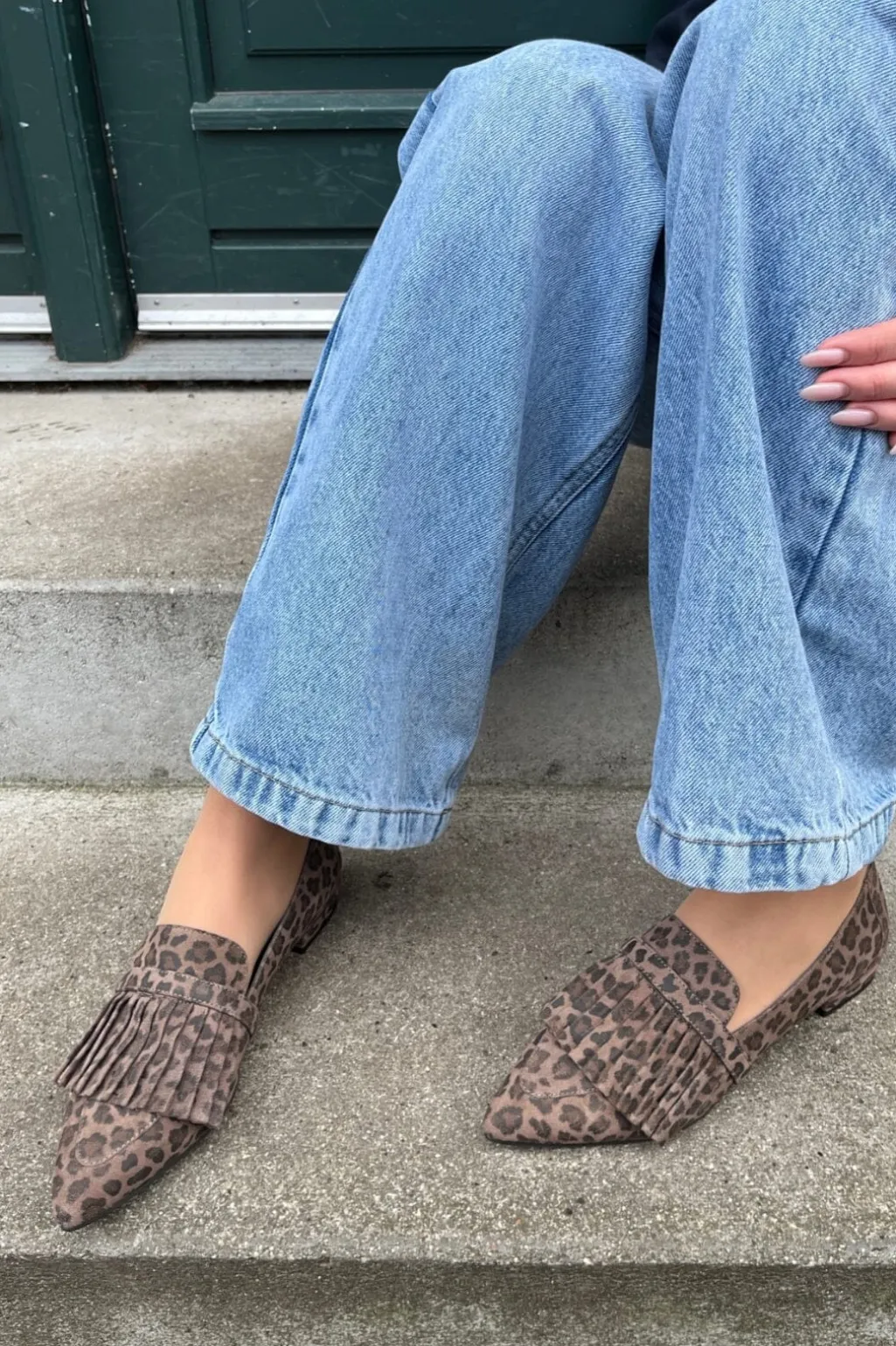 Sko fra Copenhagen Shoes i brun taupe med leopardmønster. Skoene har frynser på oversiden og en spids tå, der giver et trendy udtryk.