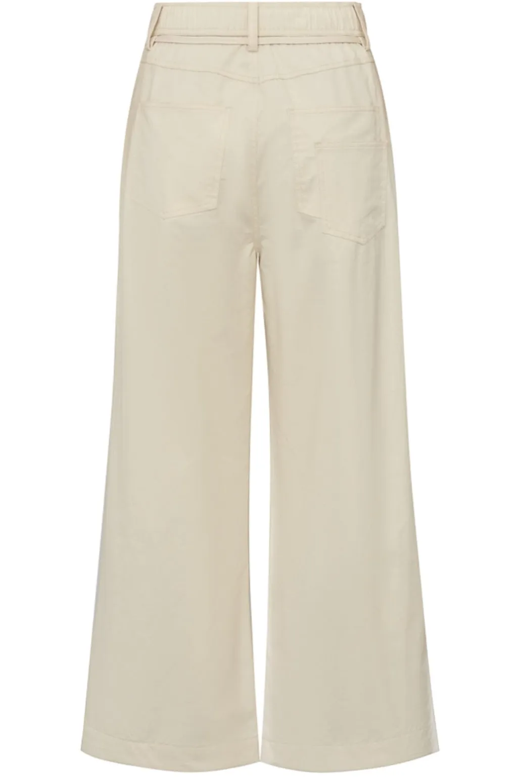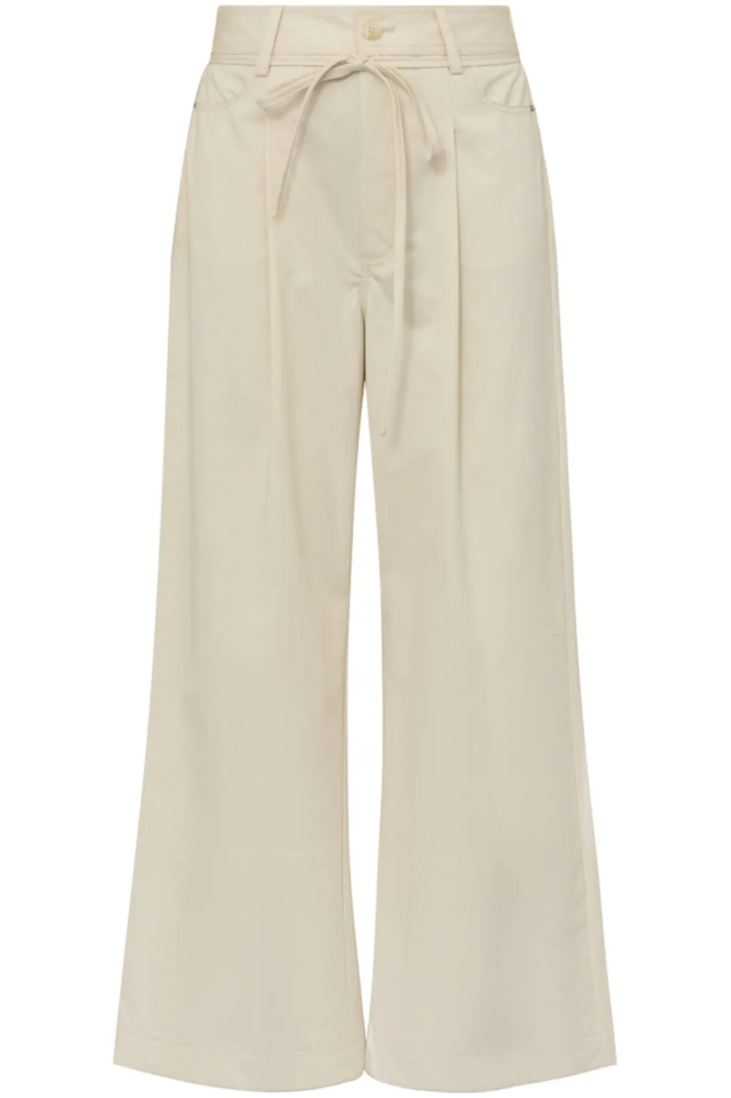 Bukser fra Gossia i en lys beige farve. De har brede ben og en afslappet silhuet med bindebånd i taljen. Bukserne er lavet af bomuld og har ankellængde.