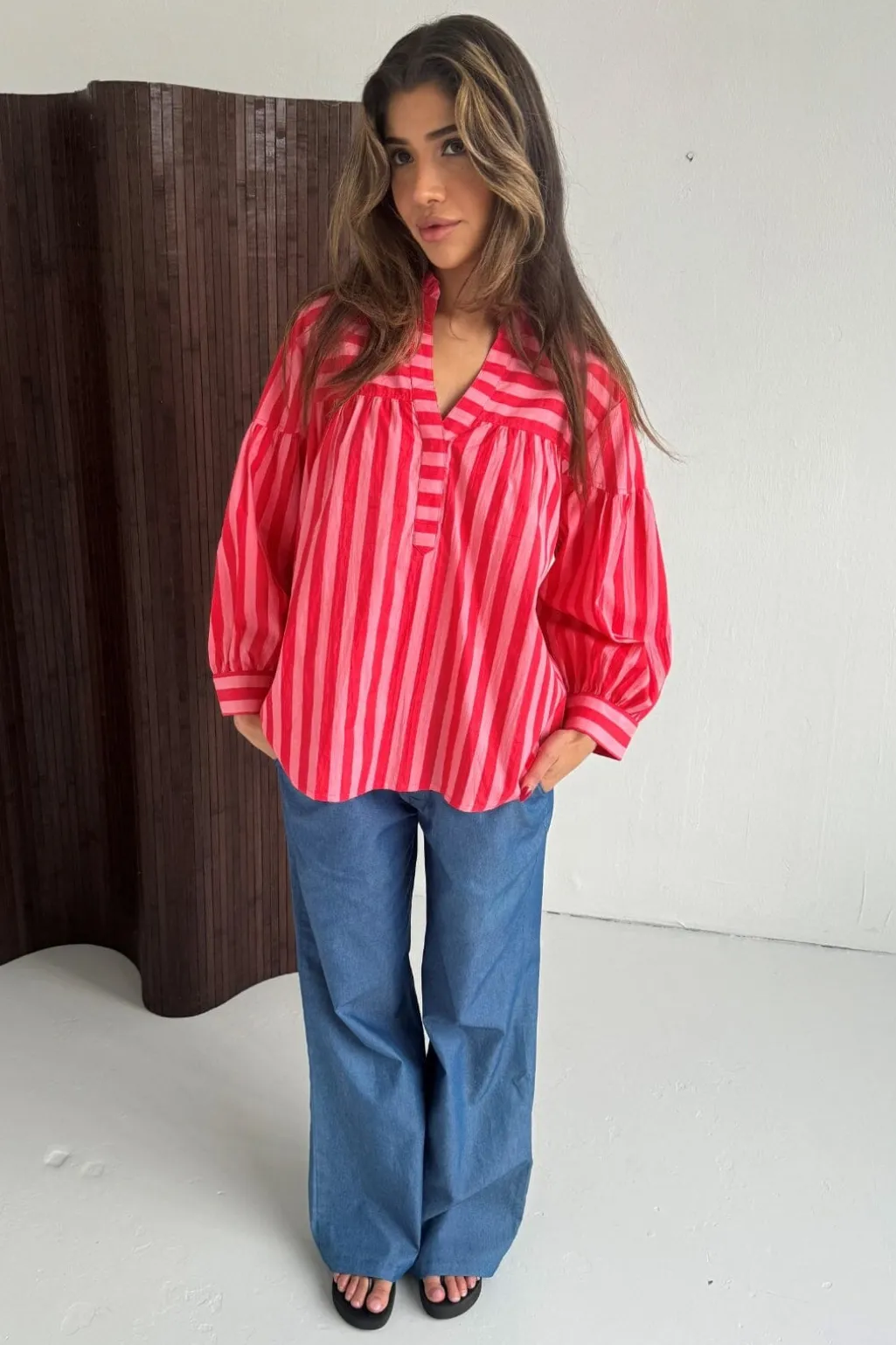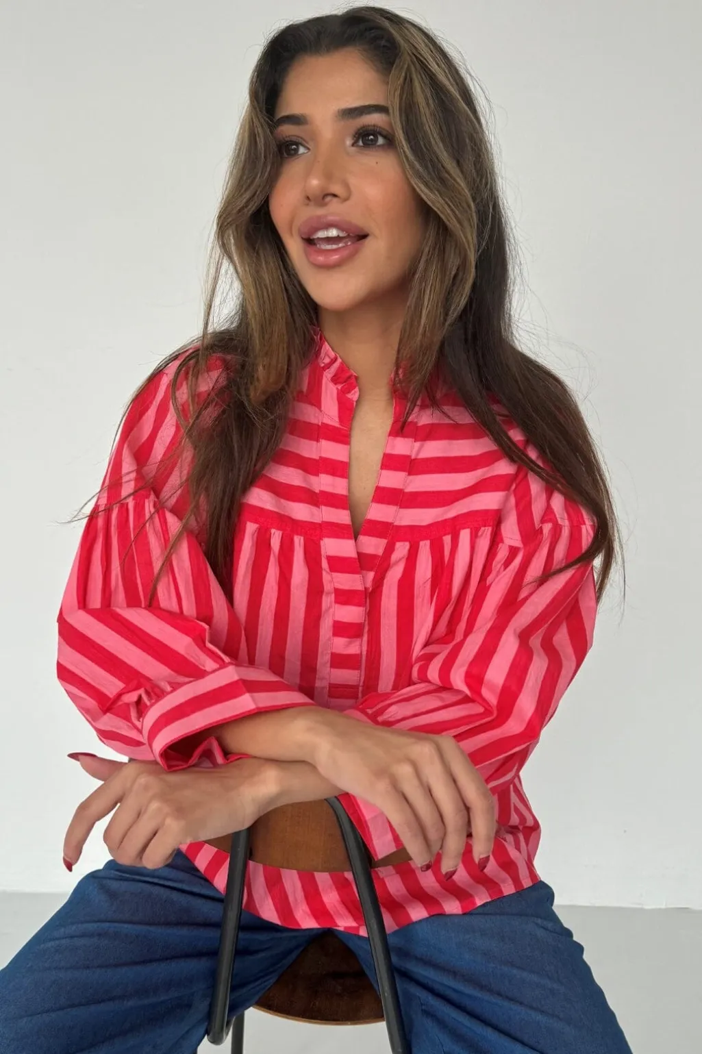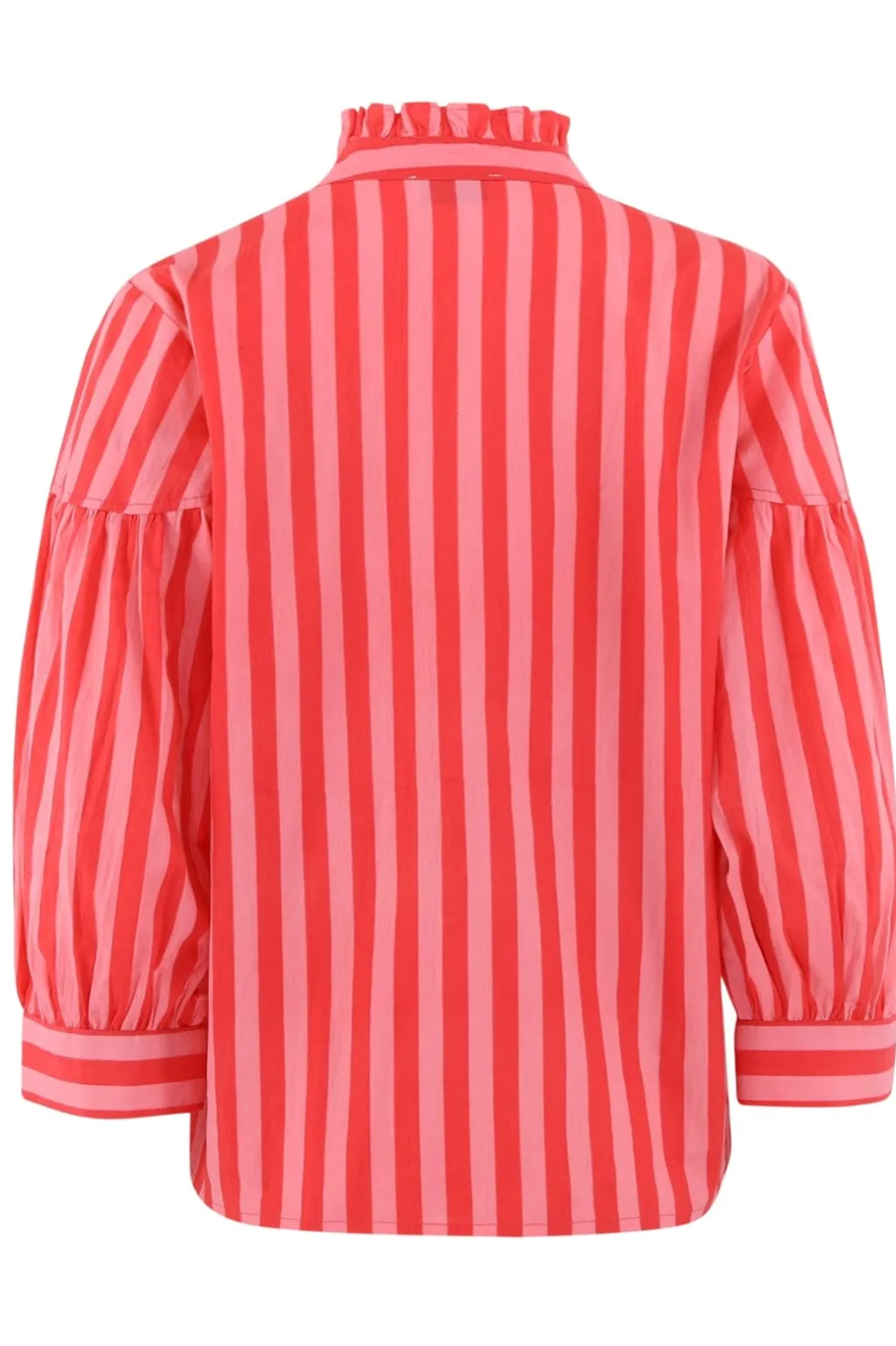 Stribet bluse fra Continue i lyse og mørke pink nuancer. Blusen har flæsedetaljer og 3/4-ærmer med balloneffekt samt en V-halsudskæring med knapper.