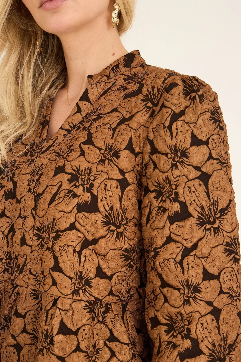 Brun kjole fra A-View med blomsterprint. Kjolen har lange ærmer, V-udskæring og en løs pasform, der går til låret.