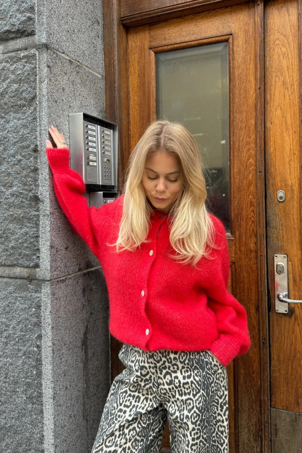 Fuzzy mohair cardigan med lange voluminøse ærmer, rib detaljer og perlemorslook på knapperne. Passer til størrelsen.