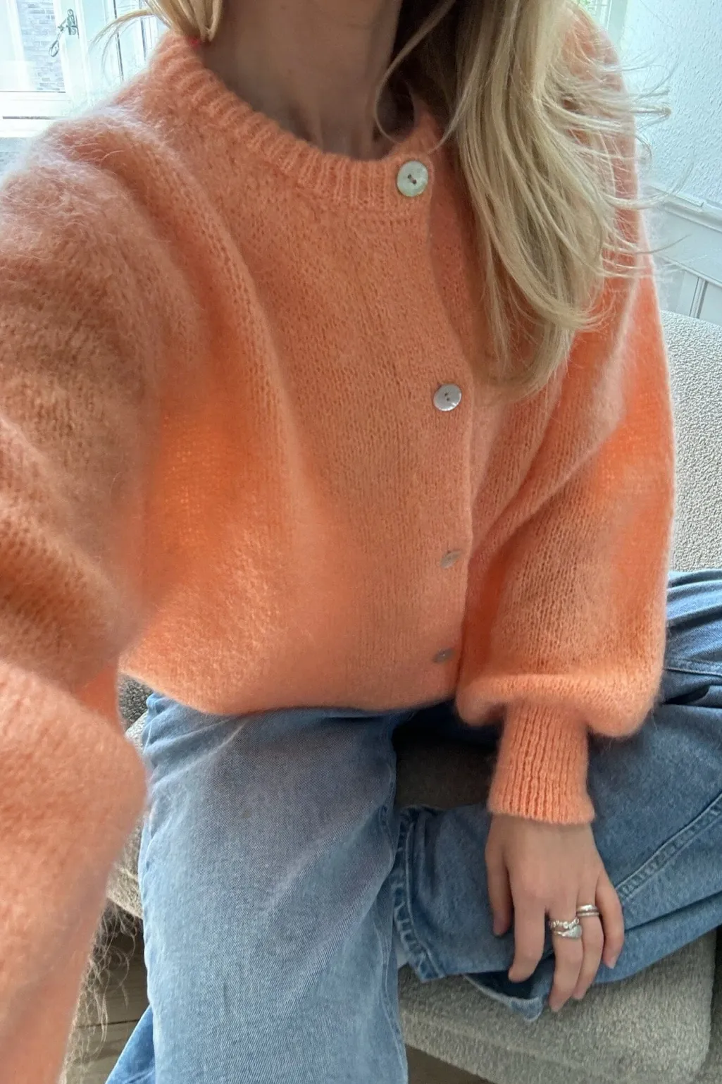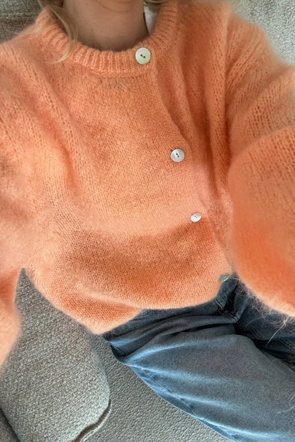 Fuzzy mohair cardigan med lange voluminøse ærmer, rib detaljer og perlemorslook på knapperne.