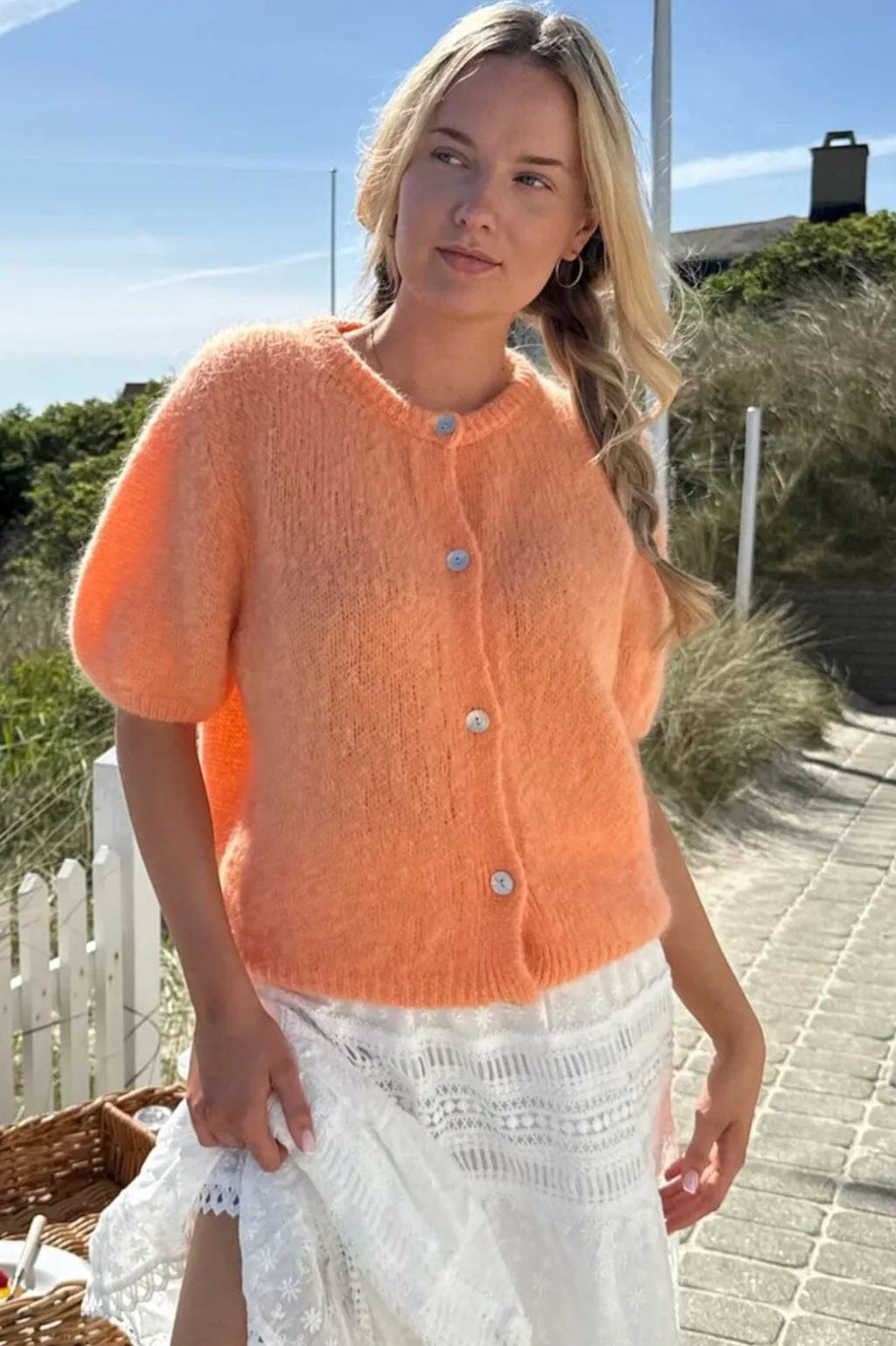 Onesize mohair cardigan med lange, voluminøse korte ærmer, ribdetaljer og knapper med perlemorslook. Normal i størrelsen.