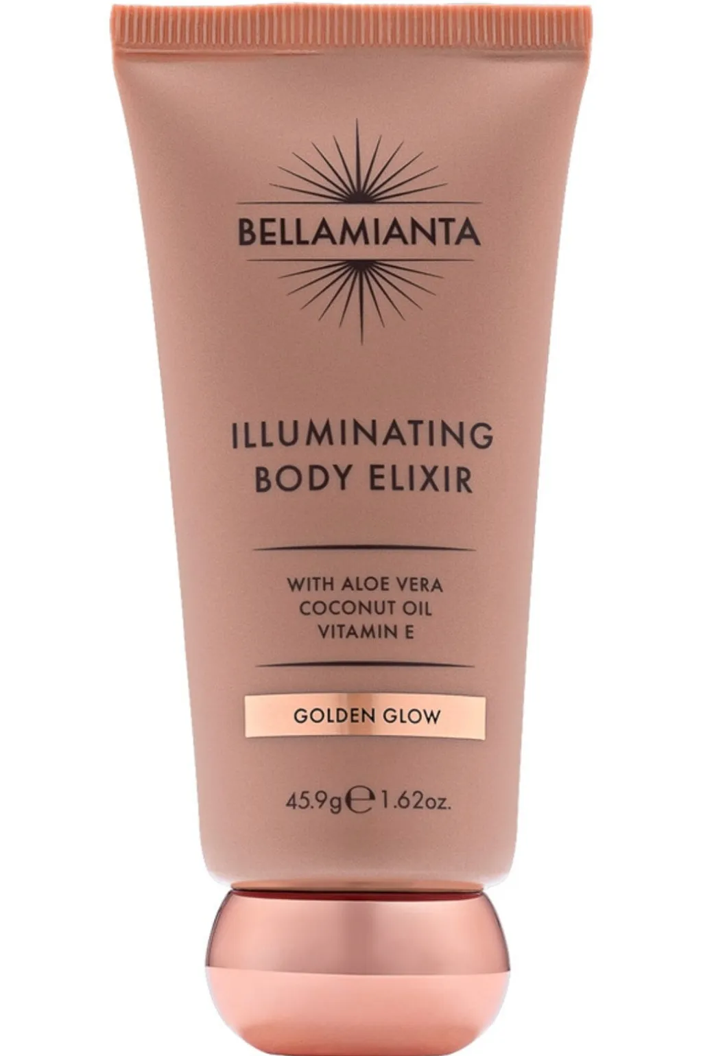 Flydende body elixir med fine shimmerpartikler, der giver huden en gylden glød. Indeholder aloe vera, kokosolie og vitamin E.